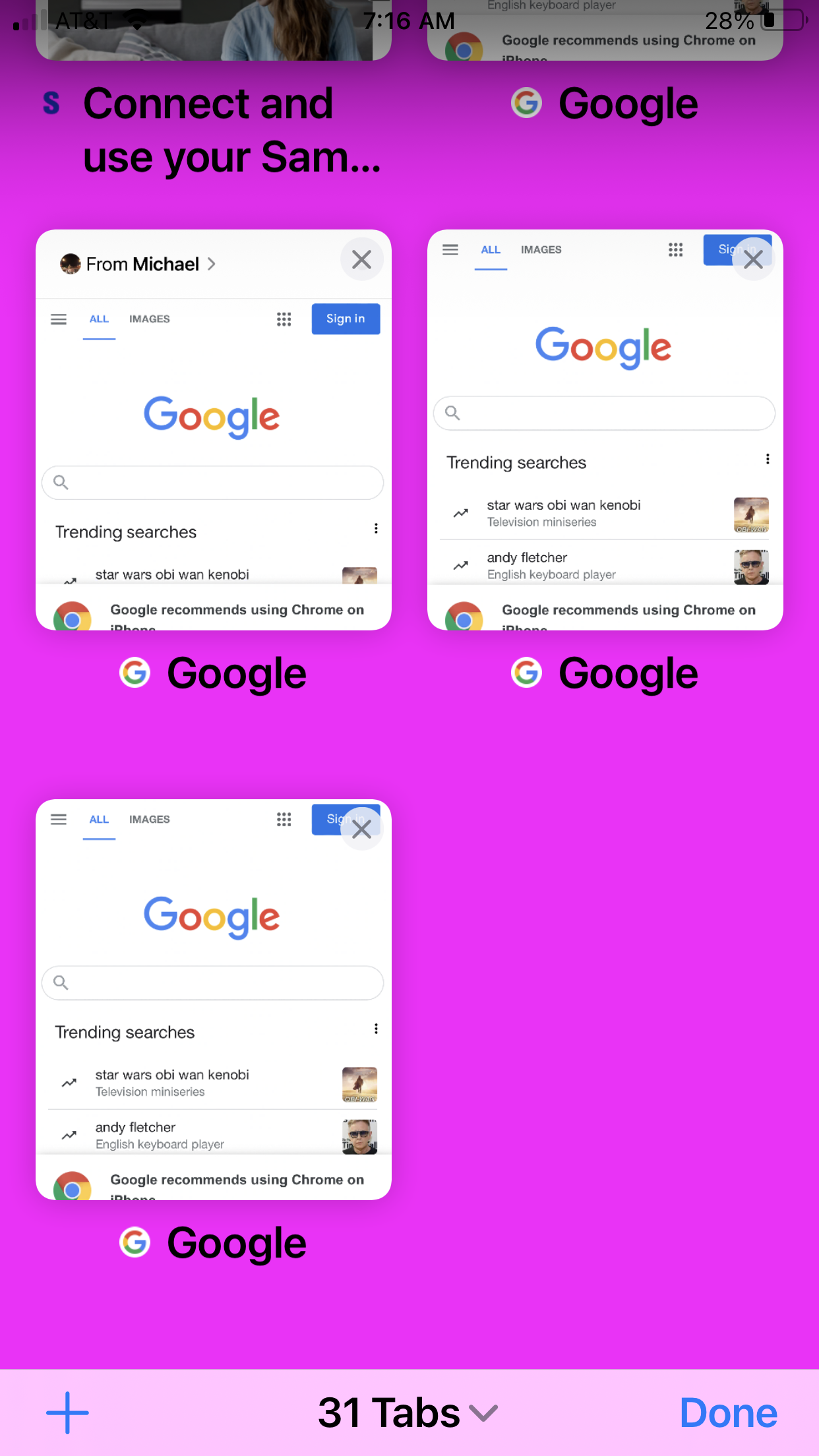 After iPhone 8+ upgrade to IOS 15.5, when I hit the icon to add a tab, the screen opens showing all my current open tabs but the background is bright pink. Use to be opaque. Unable to get rid of it, looks hideous.