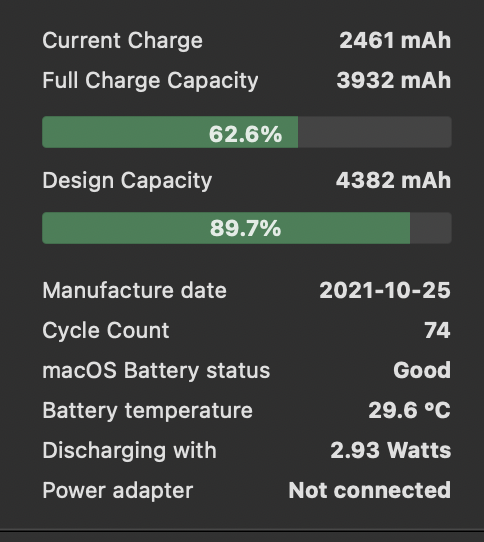 Hello guys ! Please, help, if someone have been faced with such situation. I'm user of macbook air m1, and few days ago I decided to check my how is my battery doing, and I'm was literally shocked, cause just for 74 charging cycles battery capacity fallen to the 97%, such type of made upset, but when I've seen that in CoconutBattery things are getting worse I was truly depressed. Is this is only my problem or someone faced it too ?