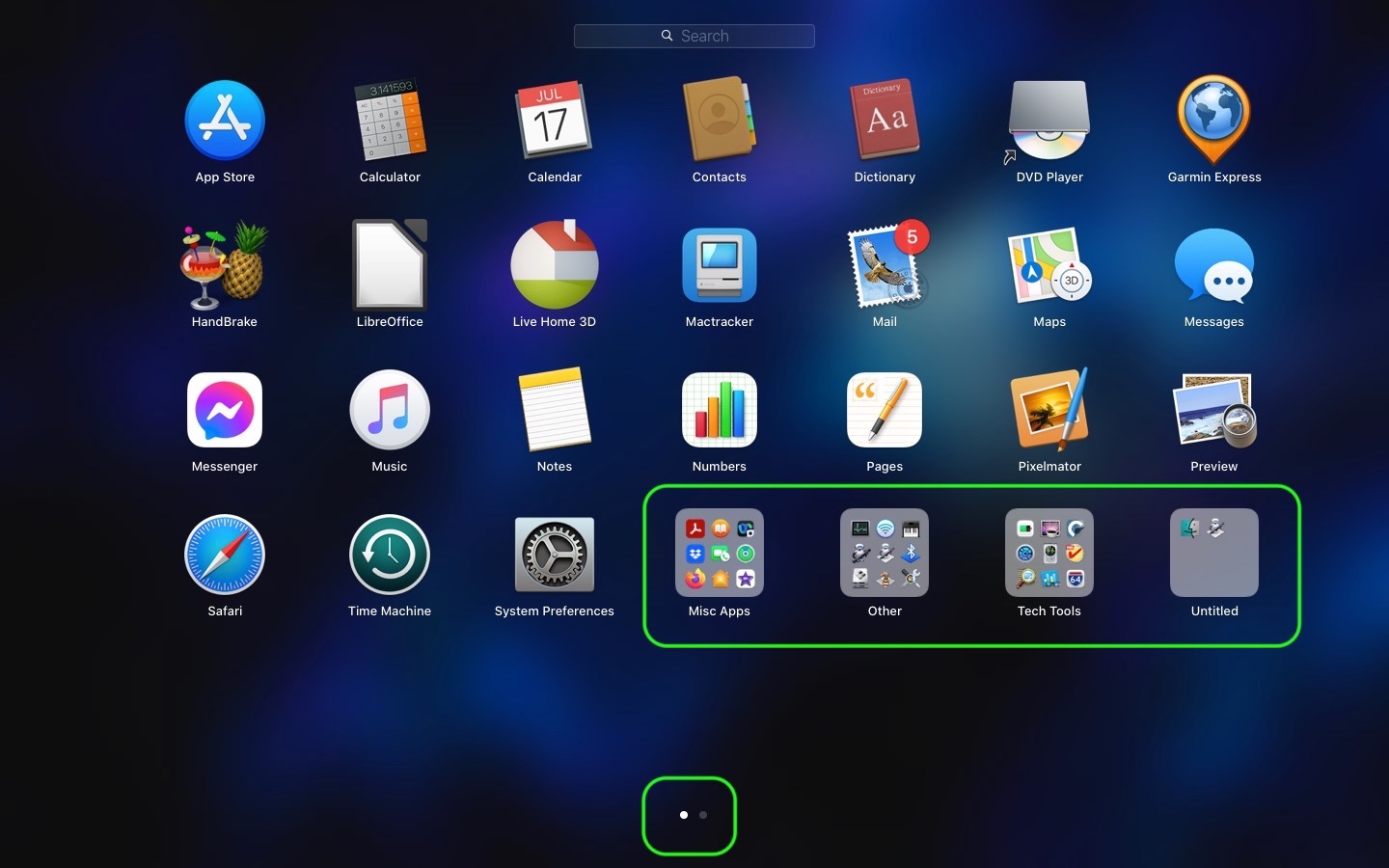 Below is how I've managed my Launchpad screen in macOS Catalina. My OCD forced me to alphabetize things via drag-and-drop, which is wholly unnecessary if the search bar at the top is used after invoking LP. But note that apps can be placed in groups by dropping one app on top of the other, then giving the group a name, as I've done. You'll also note that LP can have more than one page of apps to display, as indicated by multiple dots at the bottom. When using a trackpad, a two-finger swipe one way or another will reveal the other page(s).