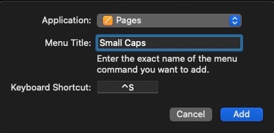 Is it possible to create a small caps short cut for Pages? I've seen questions about / solutions for this in the past, but these seem obsolete now. Ideally, I'd like to find a way to put the small caps button in my customised toolbar so that I can highlight a word and then covert it to small caps without having to to got the formatting menu, clicking on "Advanced Options", opening the drop down menu, and then selecting "small caps". Thanks!