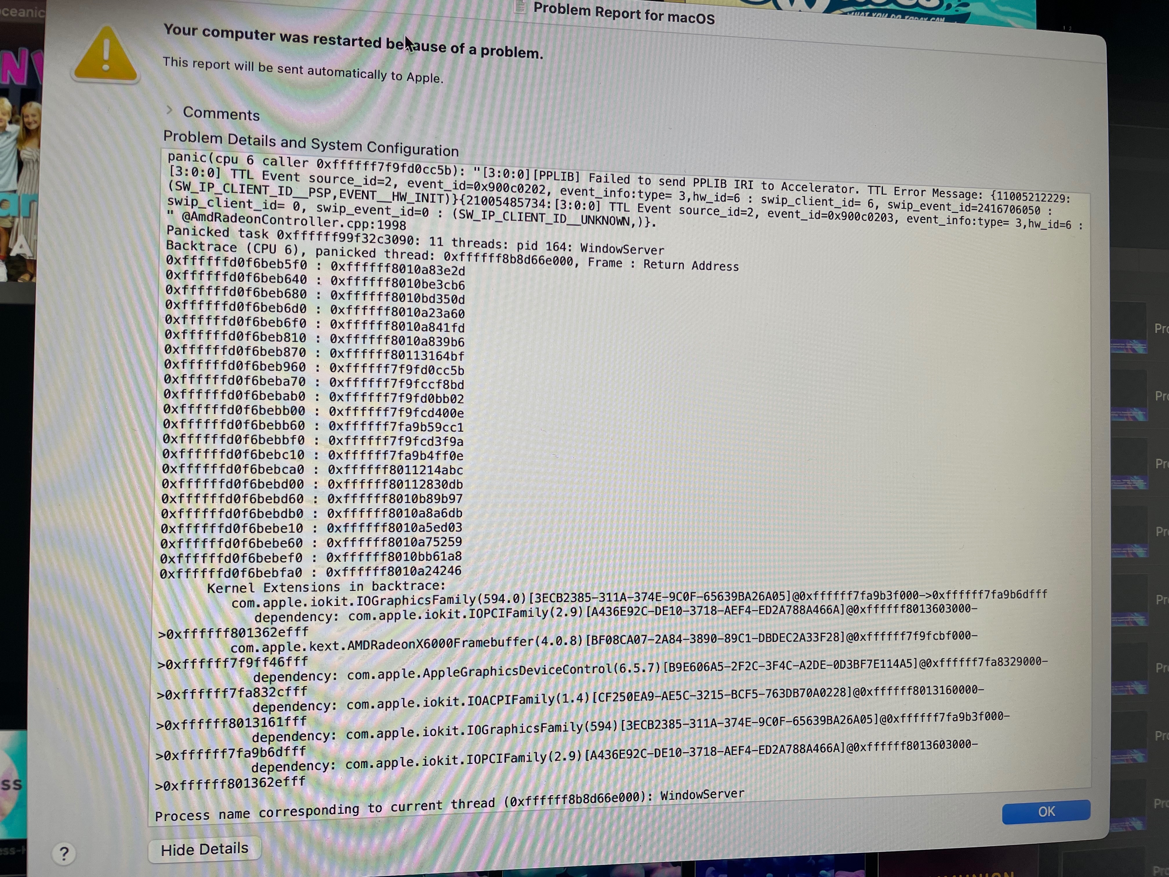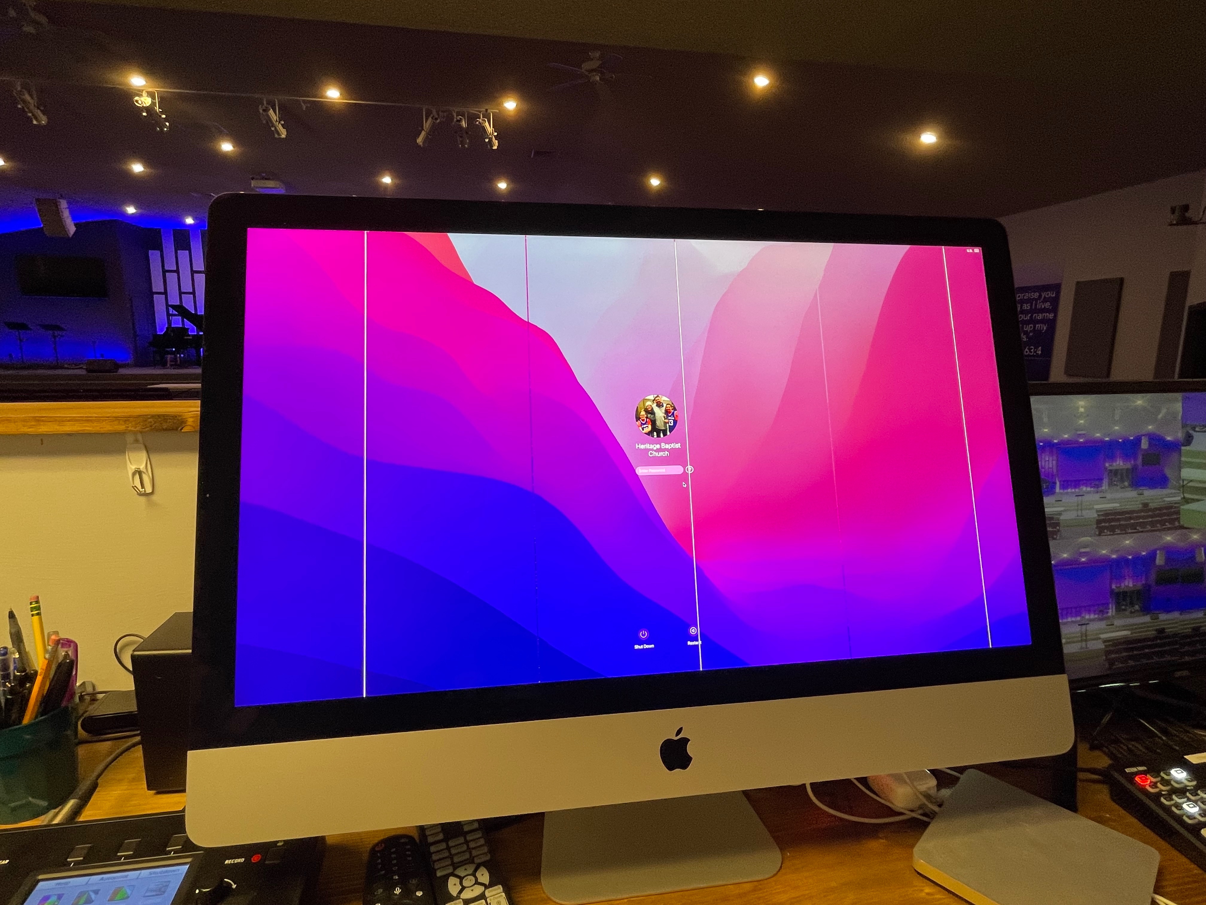 We are using a 2020 IMAC 3.6 processor 10-core intel core i9 with 32GB memory and an AMD Radeon Pro 5700 XT 16GB Graphics card. It continuously crashes any time we use ProPresenter 7 or photoshop. The display freezes or turns green. Attached are some photos that hopefully can help. Thanks for any input/solution.