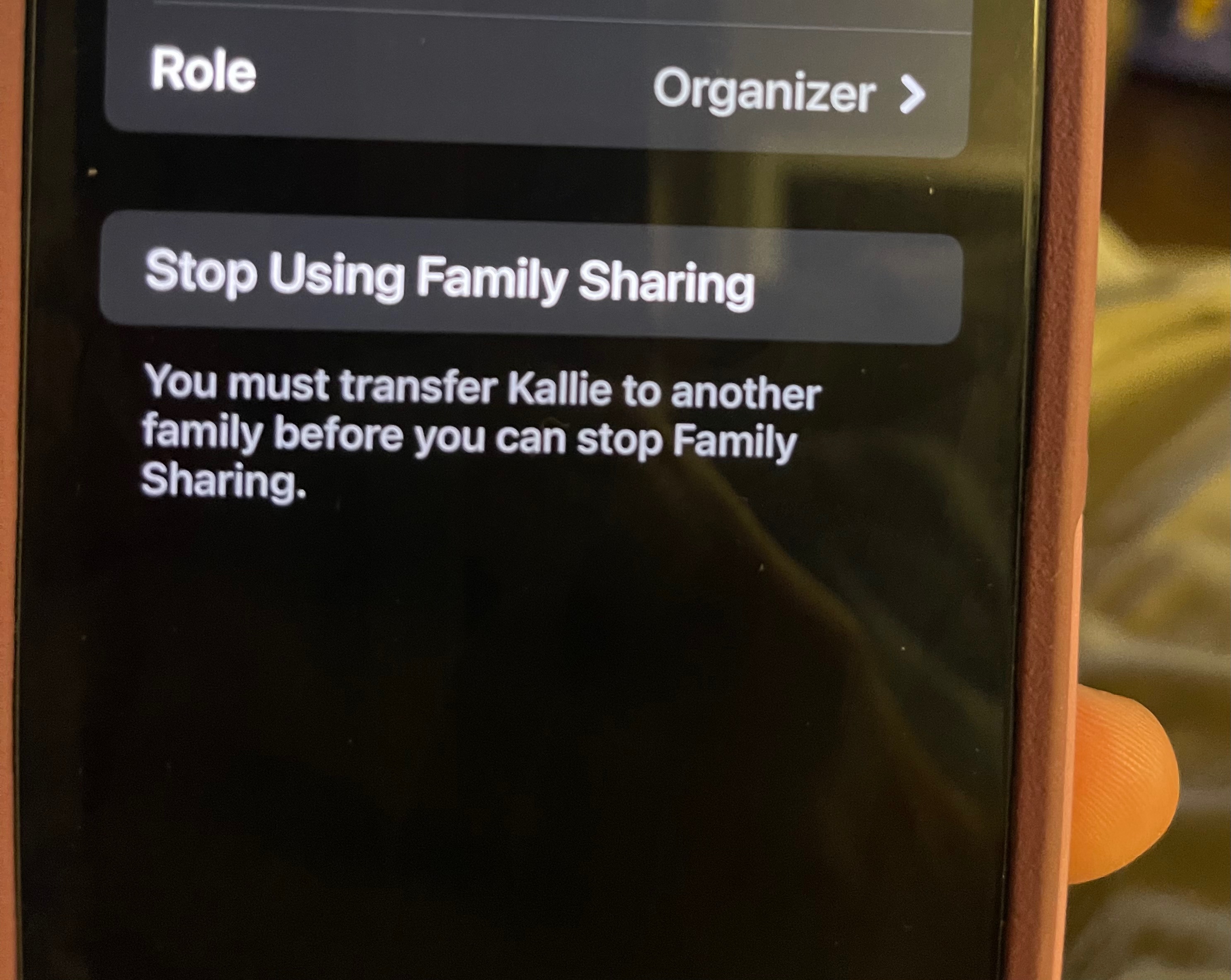 I have tried the link however, I am not receiving a request to transfer her account to another family. So…. To recap…. After following all information in link and several hours of reading and watching videos, I can not transfer her account because it doesn’t give me an option to, the child’s phone will not open the invitation because she is part of another family, the current organizer can’t leave, or stop family sharing until child is transferred to another family and I can’t do that because a family transfer request never shows up probably because the child can’t open the invitation because she is part of a family of which she needs to be transferred from. Ughhhhhhh!!!