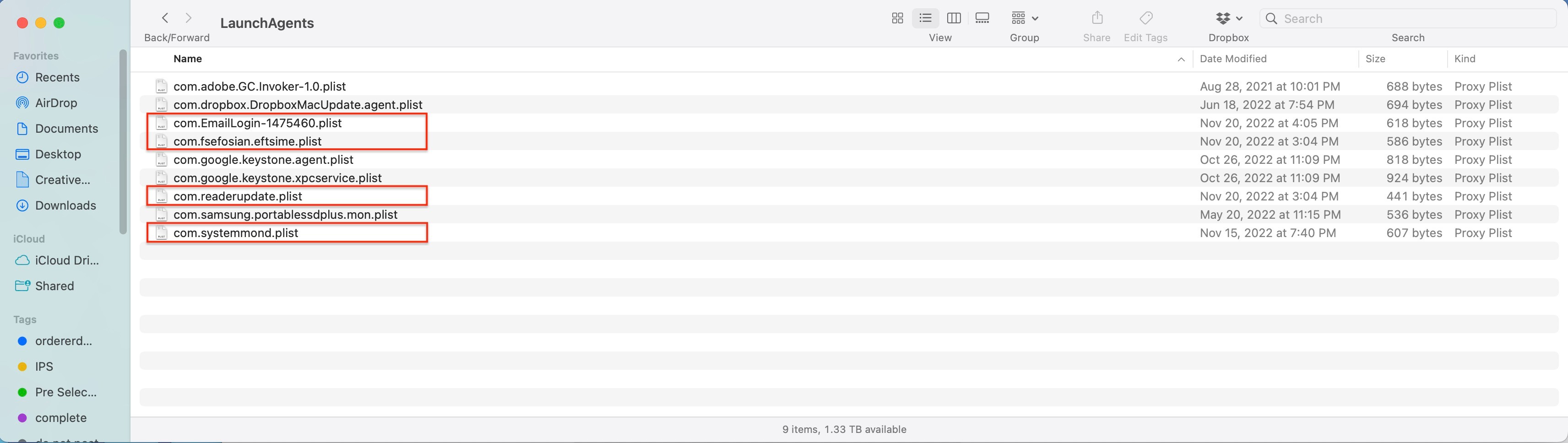 Efitz659, solving the problem requires that you follow instructions with care. Your last screenshot shows the contents of /System/Library/LaunchAgents, which is not one of the three you need to examine.