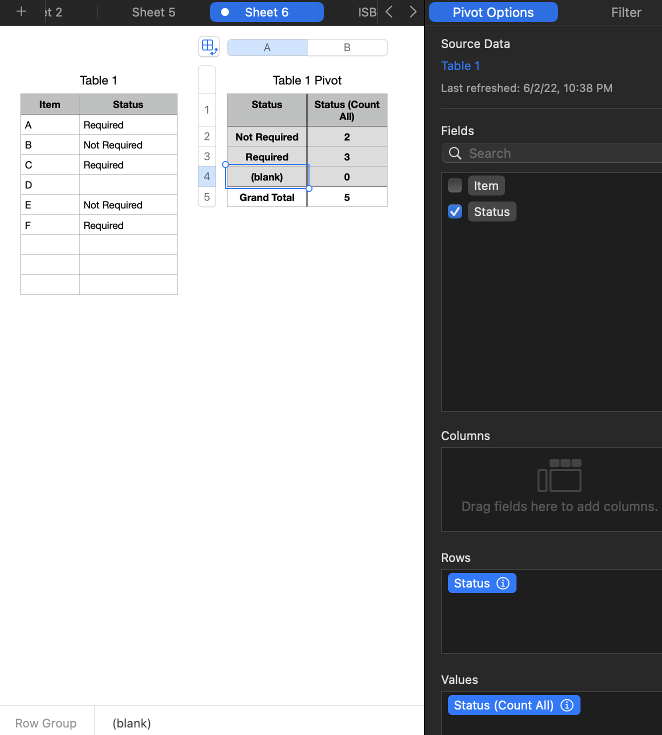 I have a Numbers spreadsheet and one of the columns is text. Some of the rows in that column are empty. I create a pivot table and want to get a count of all the occurrence of text values in that column. So for example, I have "Required", "In Progress", "Not Required" plus as mentioned, some of the cells are empty. In the resultant pivot table I get the correct count of the number of occurrences of the above values. A row is generated for the empty cells called "(blank)" but the count is 0 which is wrong because I have many blank cells. I tried changing the source table column cell data format from "Automatic" to "Text" but the results are the same. I also have tried putting a space in the blank cells and the pivot table creates new a row where the row name is empty (likely there is a single space in it) and correctly counts the number of rows I've put a space in. The "(blank)" row is still there and the count is still 0.