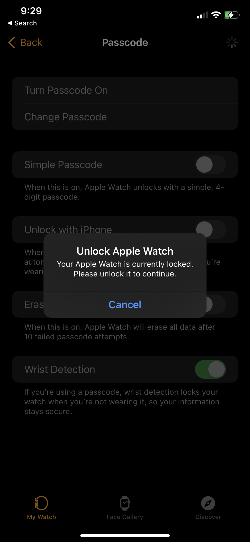 Bought the watch yesterday, followed the steps but was never asked to set up a passcode. Was working ok. The battery died and after recharging it got a message: device locked Unlock iPhone to start using Apple Watch. The problem is that my phone is unlocked :( . Restarted the watch but that didn’t help.