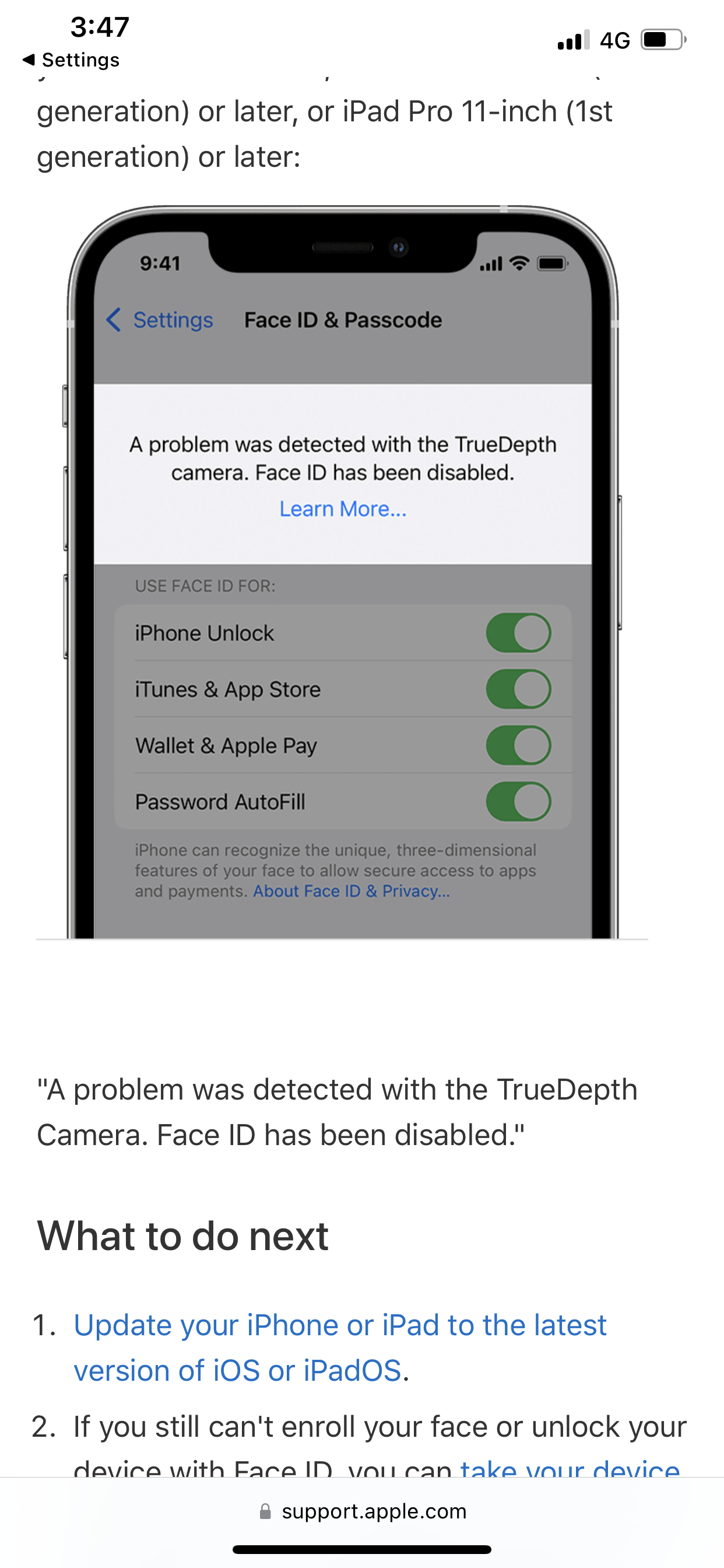 A problem was detected with the TrueDepth camera. Face ID has been disabled.