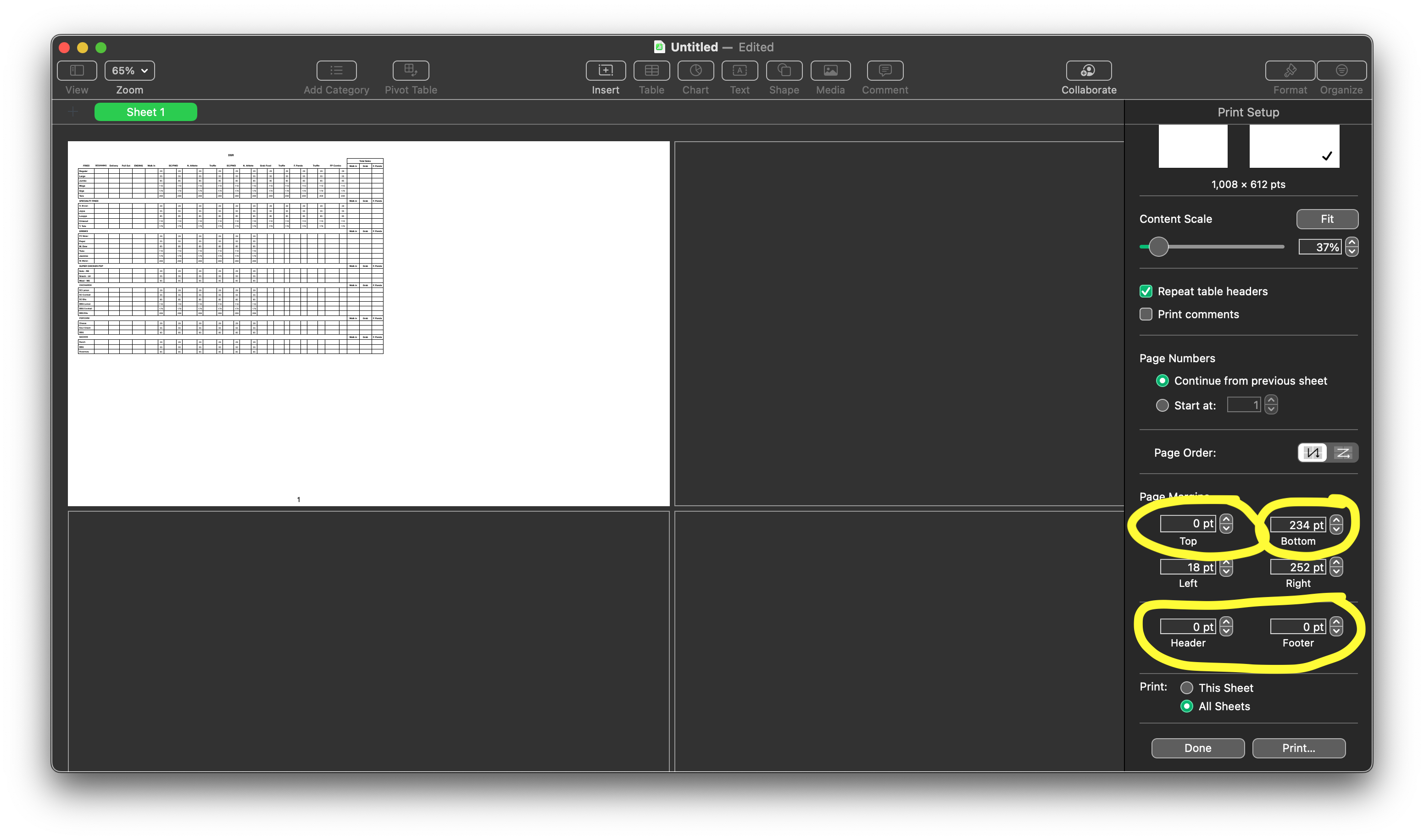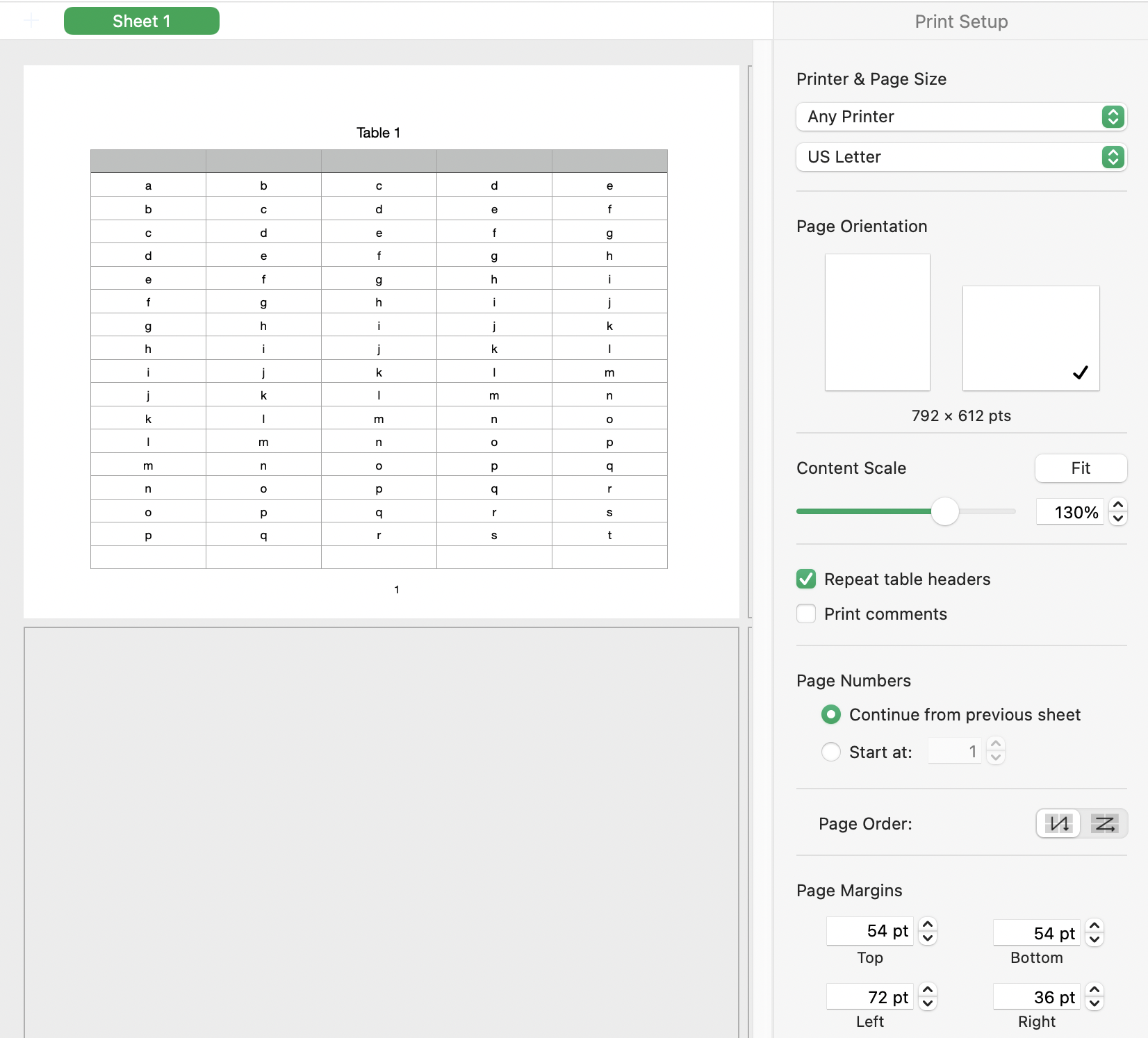 My two goals when setting the margins (and the scale) are to leave enough room on the right side to keep the table on one page, then adjust the left margin to push the table to the visual horizontal centre of the page. The five settings (scale, and four margins) shown in the right sidebar gave the result I was looking for.
