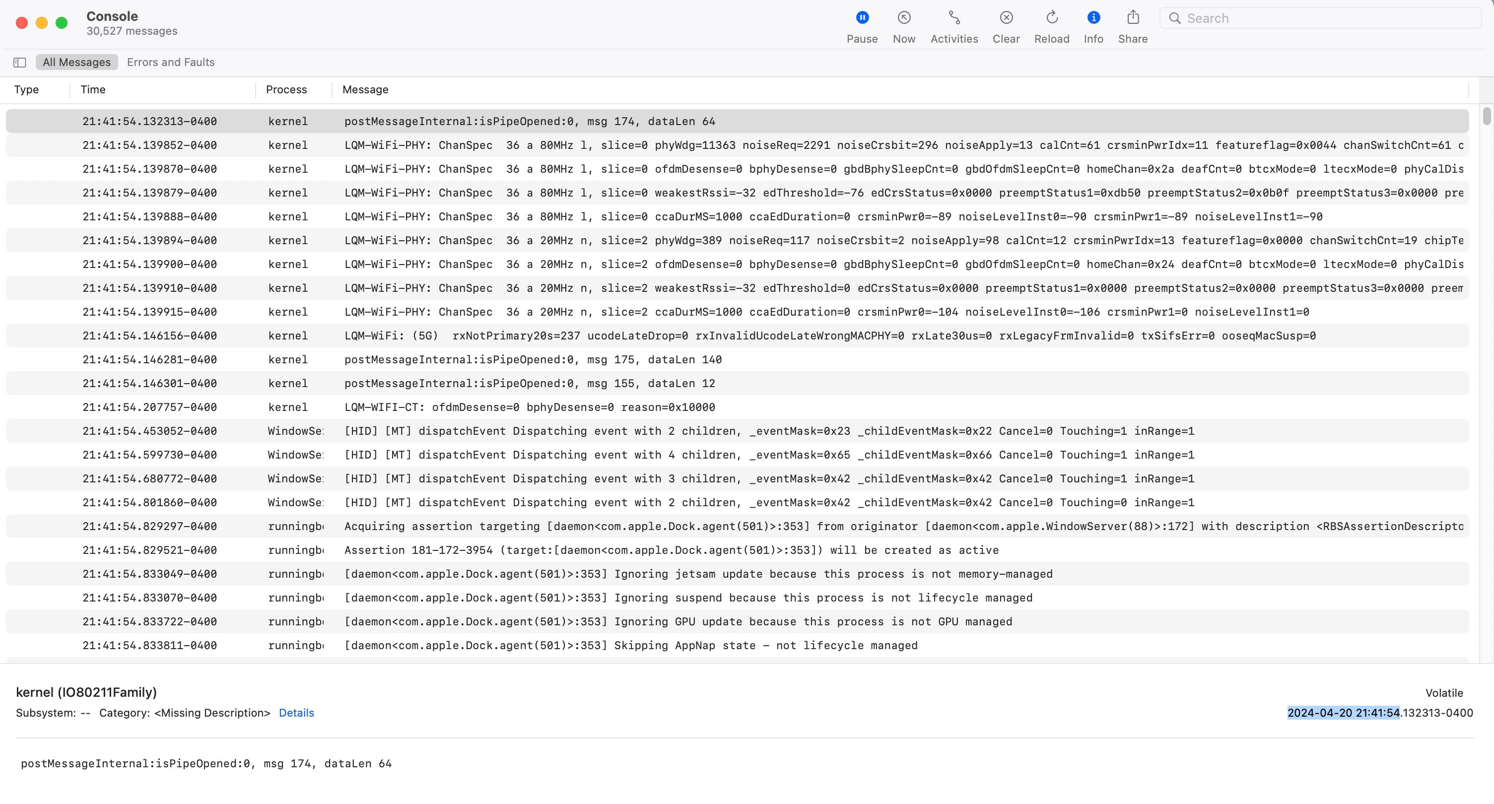 Good thought, that occurred to me earlier...just tried to explore that, and since I've not messed with Console in quite a while, I see Apple has changed the interface :-( A quick look through seemed to indicate that I had to do a "Start Streaming" which resulted in this screen shot I took, that is pretty much above my pay grade, if that keys anything for you, I'm all ears!