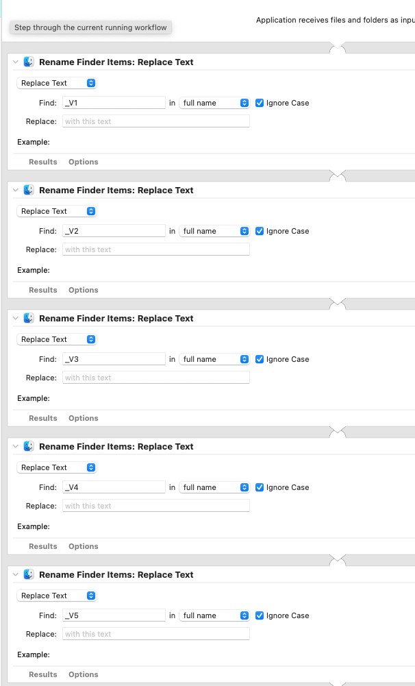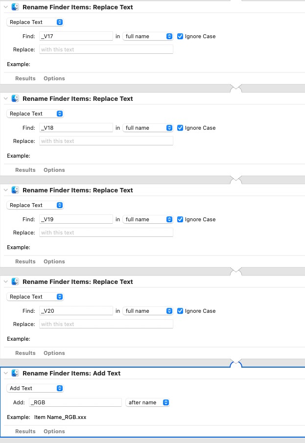 I have frequently have different versions of images, denoted by a _V1, _V2 _V3 etc Suffix. I just need a quick way to remove these varying suffixes and replace them with _RGB. I currently have a series of RENAME FINDER ITEMS to find the varying V numbers and remove them, culminating in a RENAME FINDER ITEM to add _RGB as shown below.