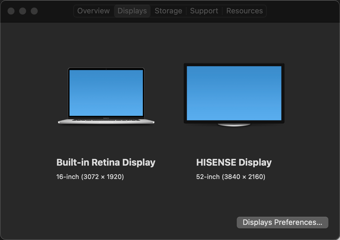 I have a MacBook Pro 2019 and a 50" Hisense H8G (https://www.hisense-usa.com/tv-and-audio/televisions/all-tvs/50H8G_50-quantum-4k-uled-hisense-android-smart-tv-2020). I connect the Macbook to the H8G via an Anker USB-C to HDMI adapter (https://www.amazon.com/gp/product/B07THJGZ9Z), though I've also tried 2 of Apple's USB-C Multiport Adapters (A1621).