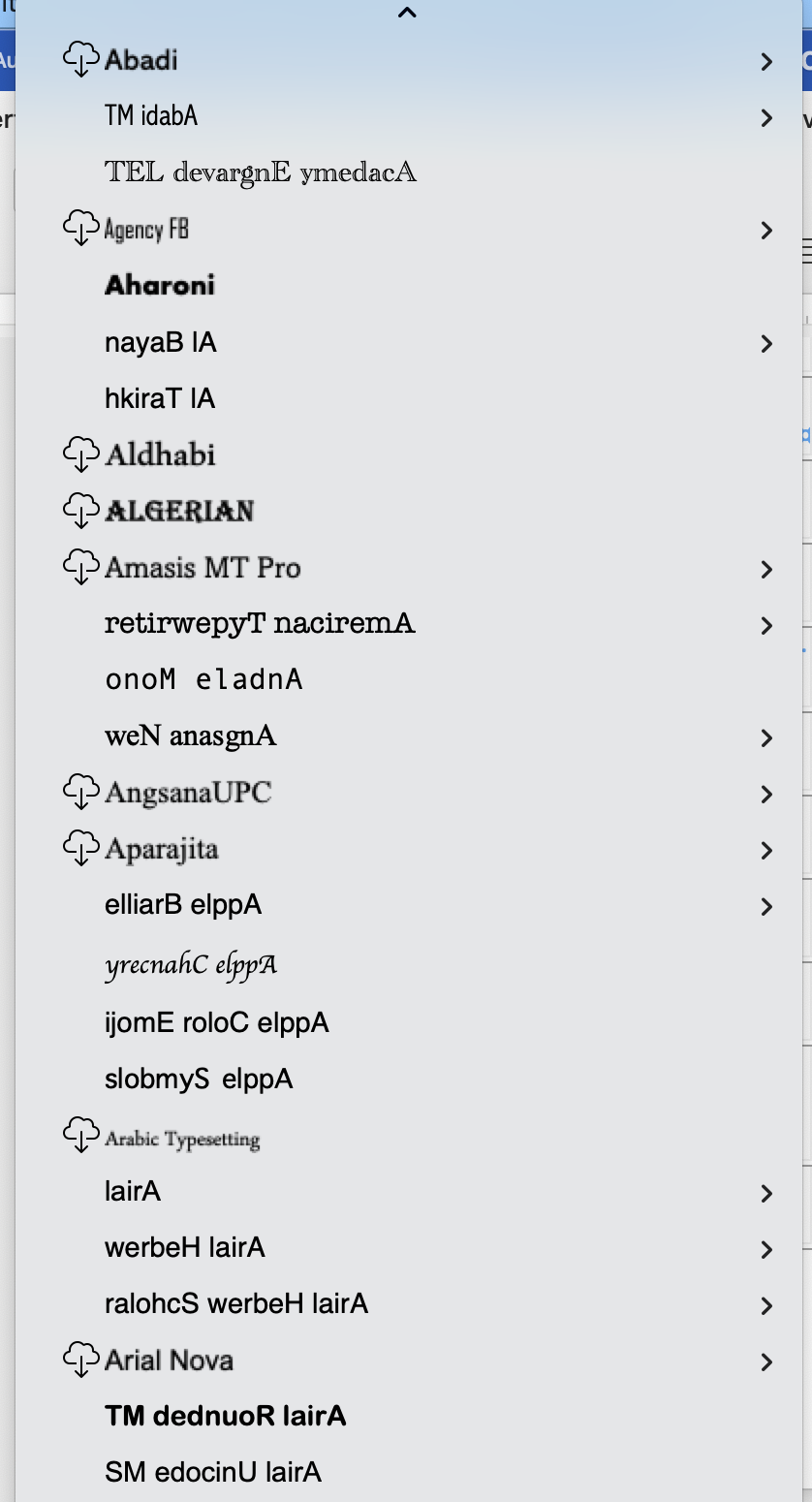 This is a screenshot of the font list in MS Word on my Mac. Any idea how to fix the ones that are mirrored?