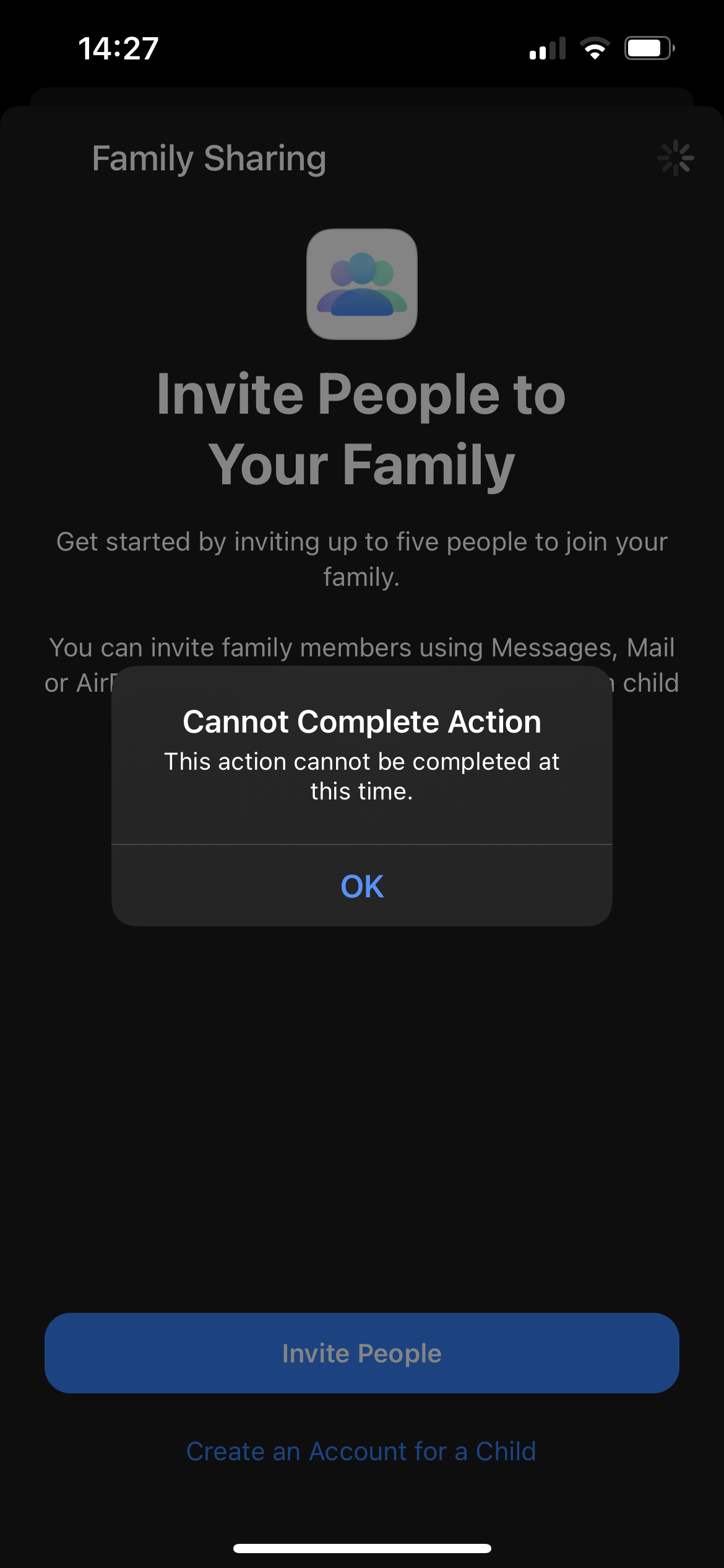 When I try to start family sharing, I get error - cannot complete action. This action cannot be completed at this time.