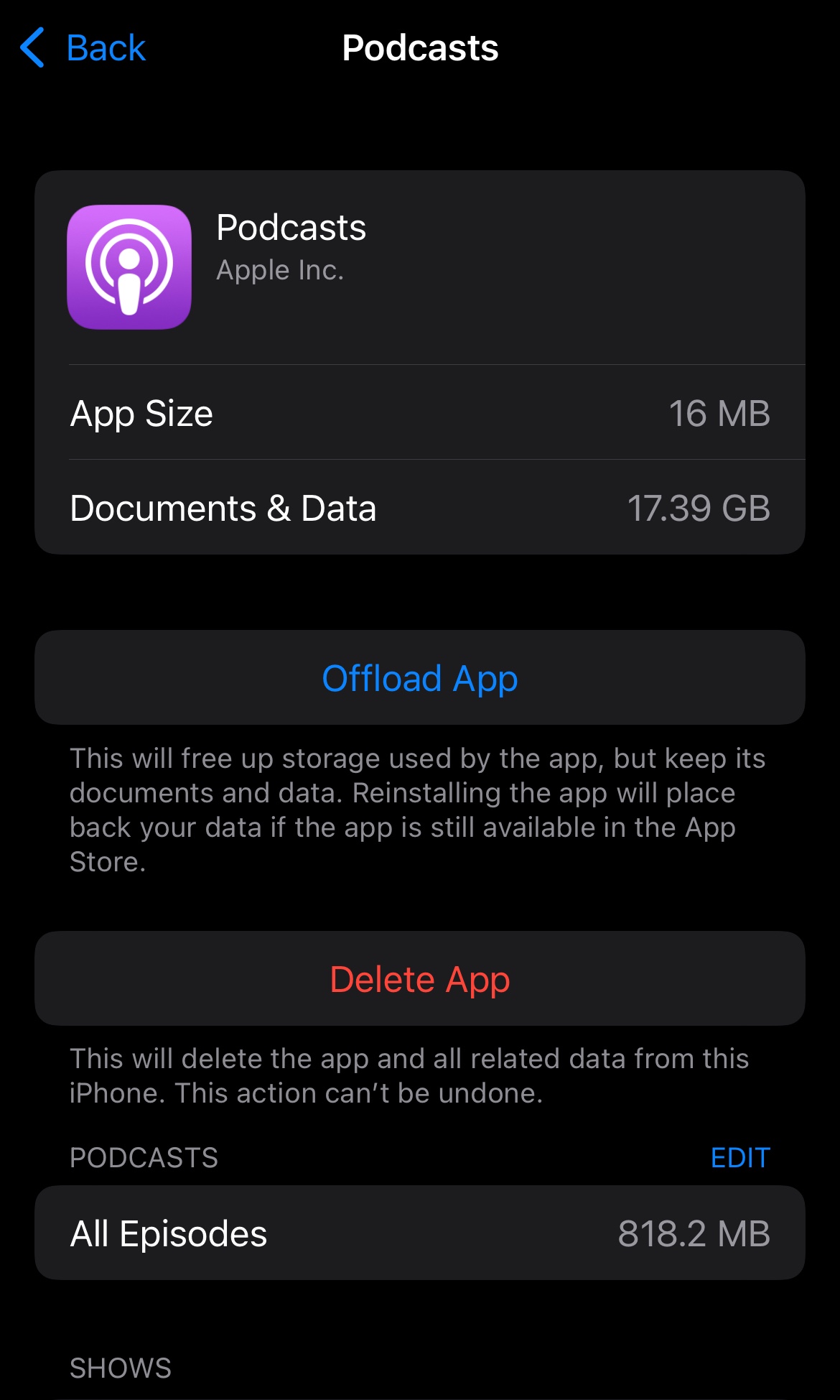 Why does the Podcasts App use so much storage space? All downloaded episodes are using 818mb of storage, yet the documents and data are using 17.39gb of storage. Why? What is the other 16+gb? Is there a fix for this?