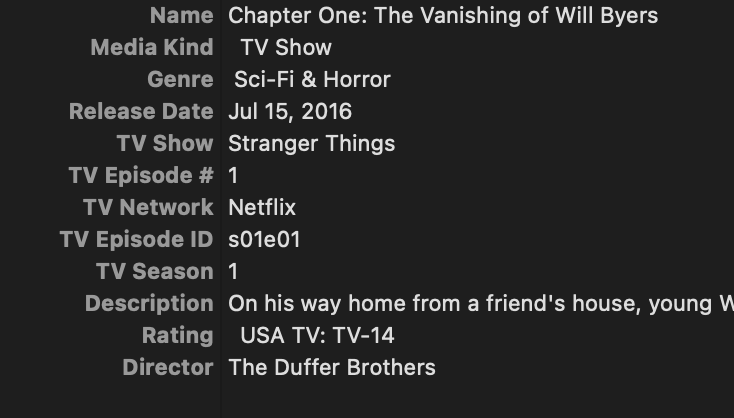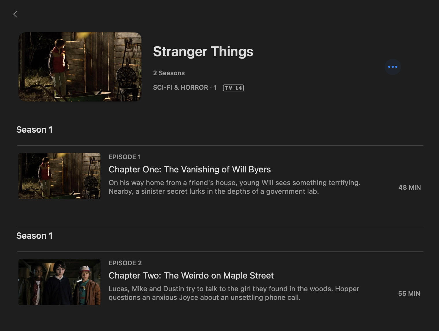 I was recently adding in my downloaded episodes of Stranger Things to the Apple TV app when I came across this problem. The episodes are showing up under the same series but thinks each episode is under different seasons all called season one. I have modified the metadata multiple times but can't get it to fix.