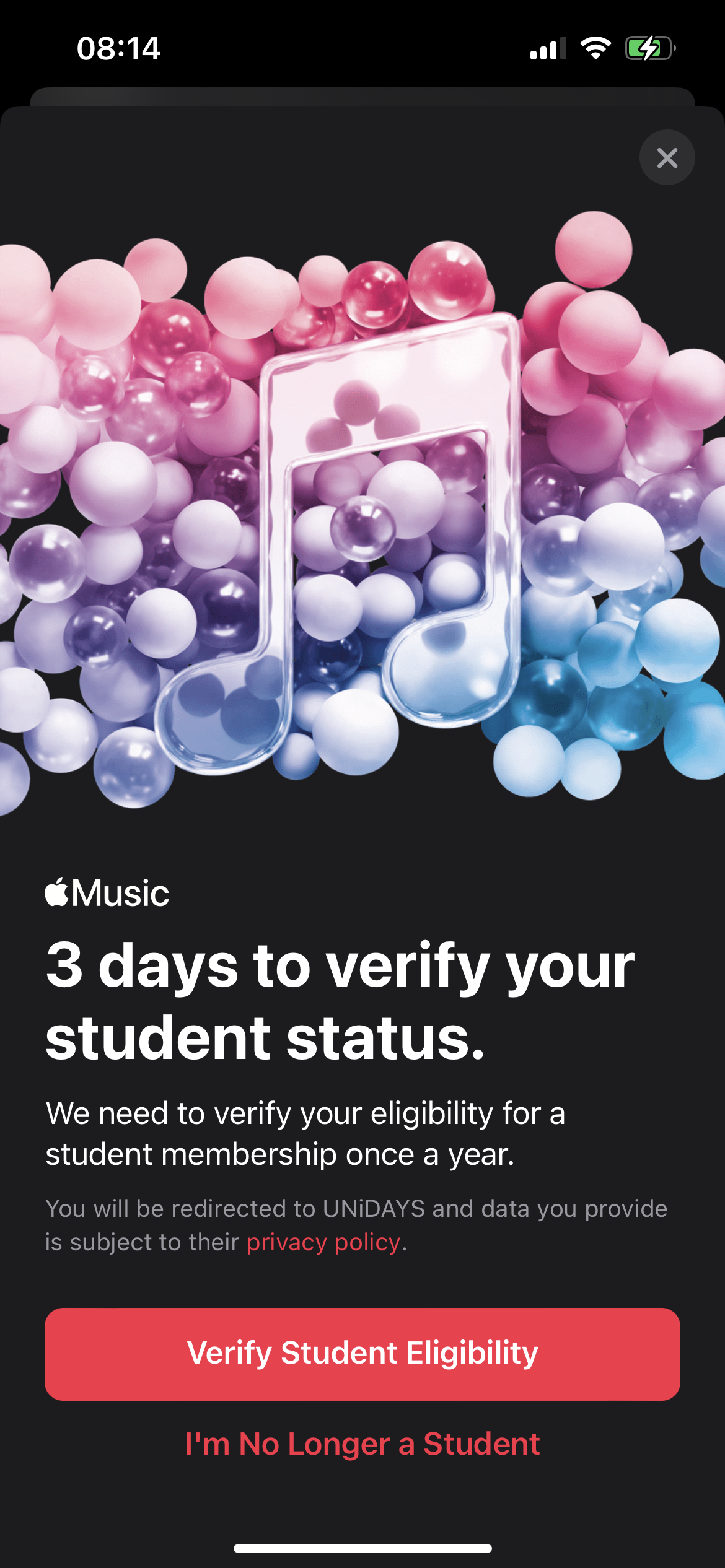 4. Follow the prompts to verify your eligibility. If the verification is successful, you'll automatically return to Apple Music and continue your Apple Music student subscription.