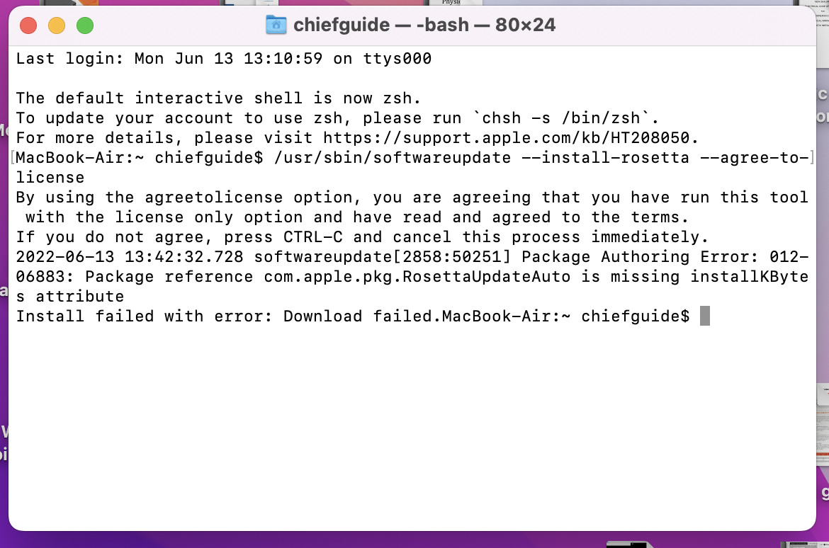 Rosetta fails to download on my new Macbook Air with M1 chip. Tried auto prompt with app, tried Terminal commands but still fails to download?