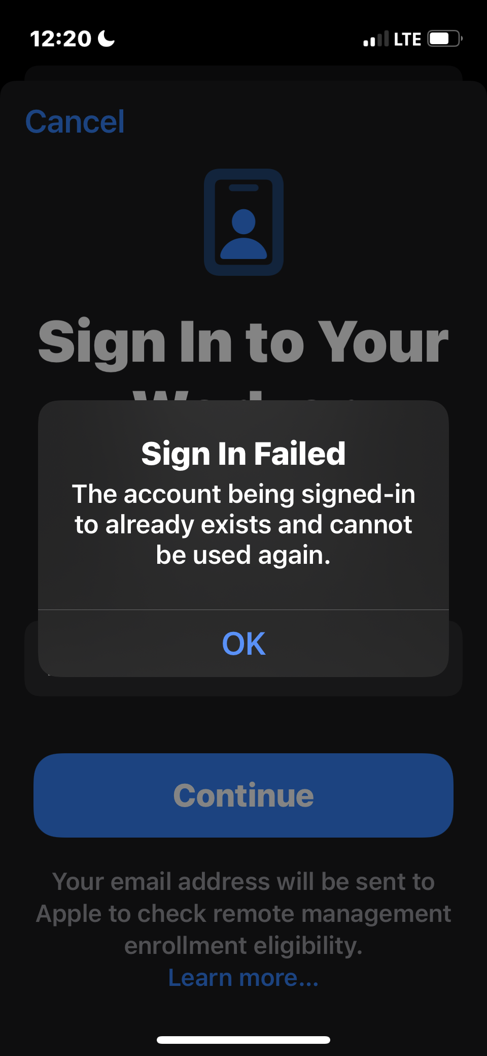 Sign in to Work or School requires a compatible MDM. If you are trying to use a personal Apple ID on that page, it will show that error because you do not have an associated Apple ID with Apple Business/School Manager and cannot sign up for it using that page. It's a weird error, and unless your device shows a profile in Settings > General > VPN & Device Management, you are not managed by MDM. You may see a wireless profile in there as some providers encourage you to install it when using their App. iOS, iPadOS, and macOS devices cannot be enrolled into MDM unless they were purchased by an organization that uses an authorized reseller connected to their Apple Business/School Manager, or unless they have physical access to your device to manually enroll. You will know at device setup whether or not either of these is the case.
