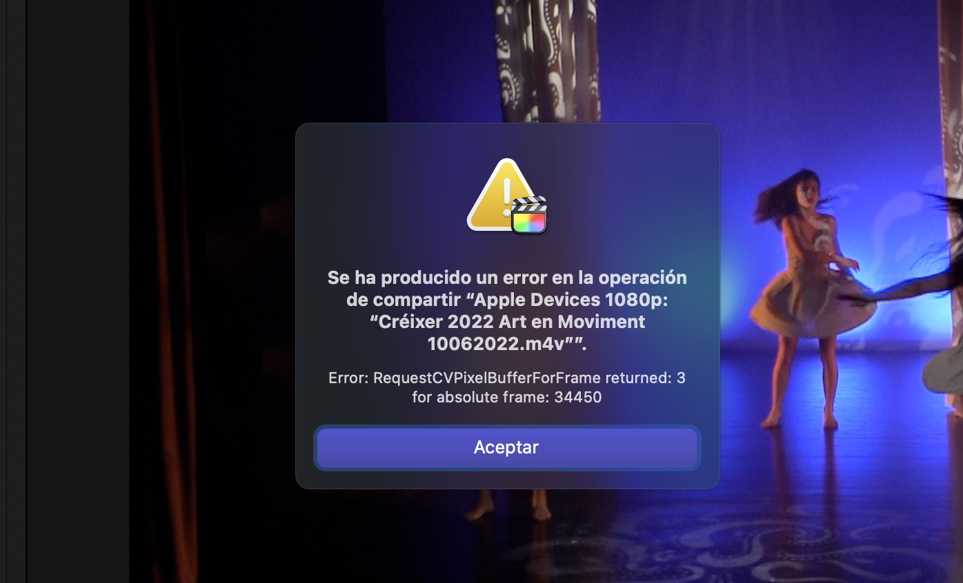 ¿Qué versiones de OS y FCP son estas? El mensaje dice que hay un error en el marco del proyecto número 34450. En las preferencias generales de FCP, cambie la visualización del tiempo para que esté en marcos. Busque el marco 34450 en el proyecto. El clip debe cortarse o reemplazarse la toma, ya que el archivo está dañado en ese punto.