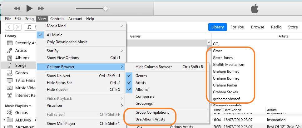 In the screenshot above, I have searched for Grace Jones. Although I have three songs by her, all of them are on compilation albums, so her name does not appear in the Column Browser/Artists column (3.) (it really doesn't, I checked as I was writing this)