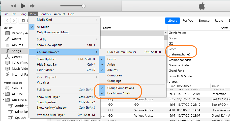 In the screenshot above, I have searched for Grace Jones. Although I have three songs by her, all of them are on compilation albums, so her name does not appear in the Column Browser/Artists column (3.) (it really doesn't, I checked as I was writing this)