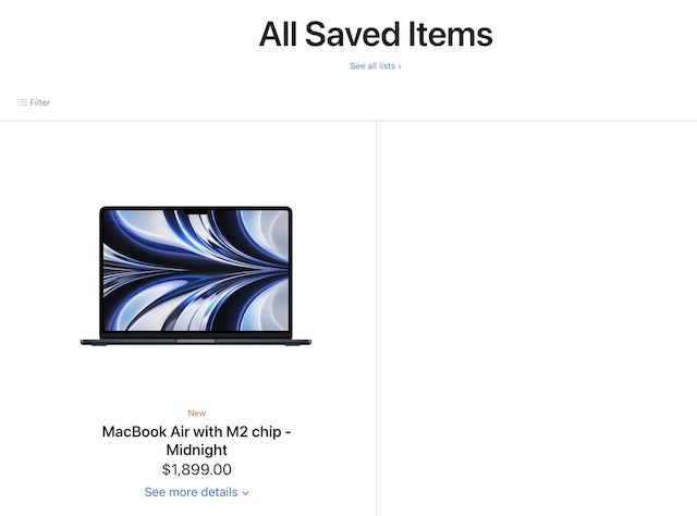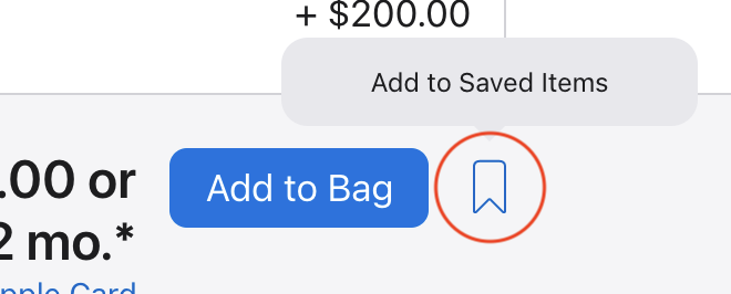 I have some items in my Apple Bag. I don't want to order them all right now. I can remove an item, but that means finding it again, going through the specs, and reordering it. I can't seem to find the Save for Later function or anything like that. There is a Saved section, but I can't see how to get an item that's in the Bag to Saved with its specs.