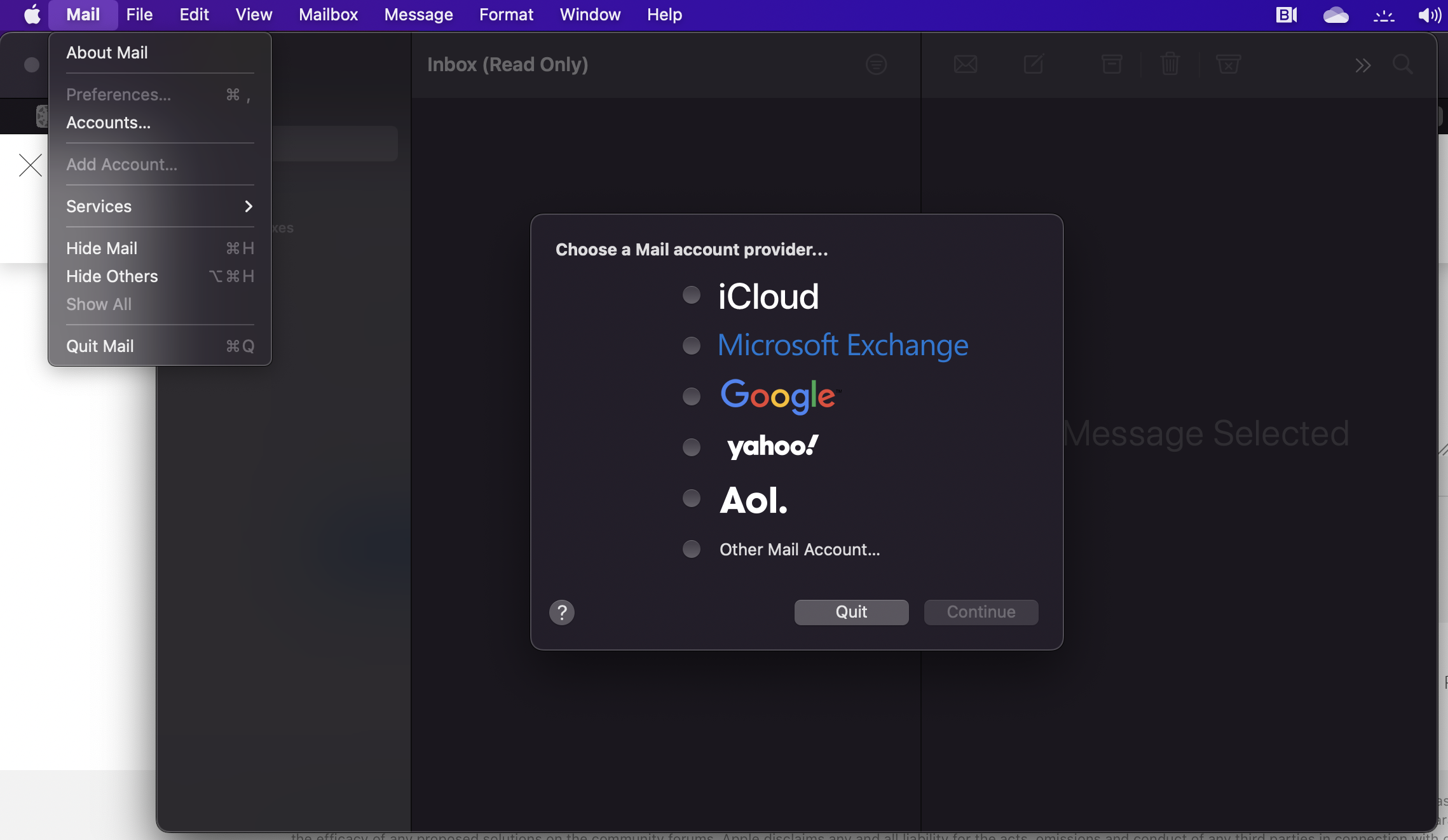 I have searched this online but every article I've seen ignores the fact that when I open the Apple Mail app, a window pops up asking me to "Choose a mail account provider ... " and the "Preferences" menu option is grayed out. (I suppose I can go ahead and set up something temporarily, but this seems like it should be unnecessary.)
