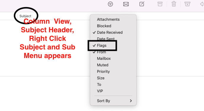 No grey flag in the heading… in Monterey IOS you can list by flag, you can flag a message but they don’t appear next to the messages Inbox. Never…