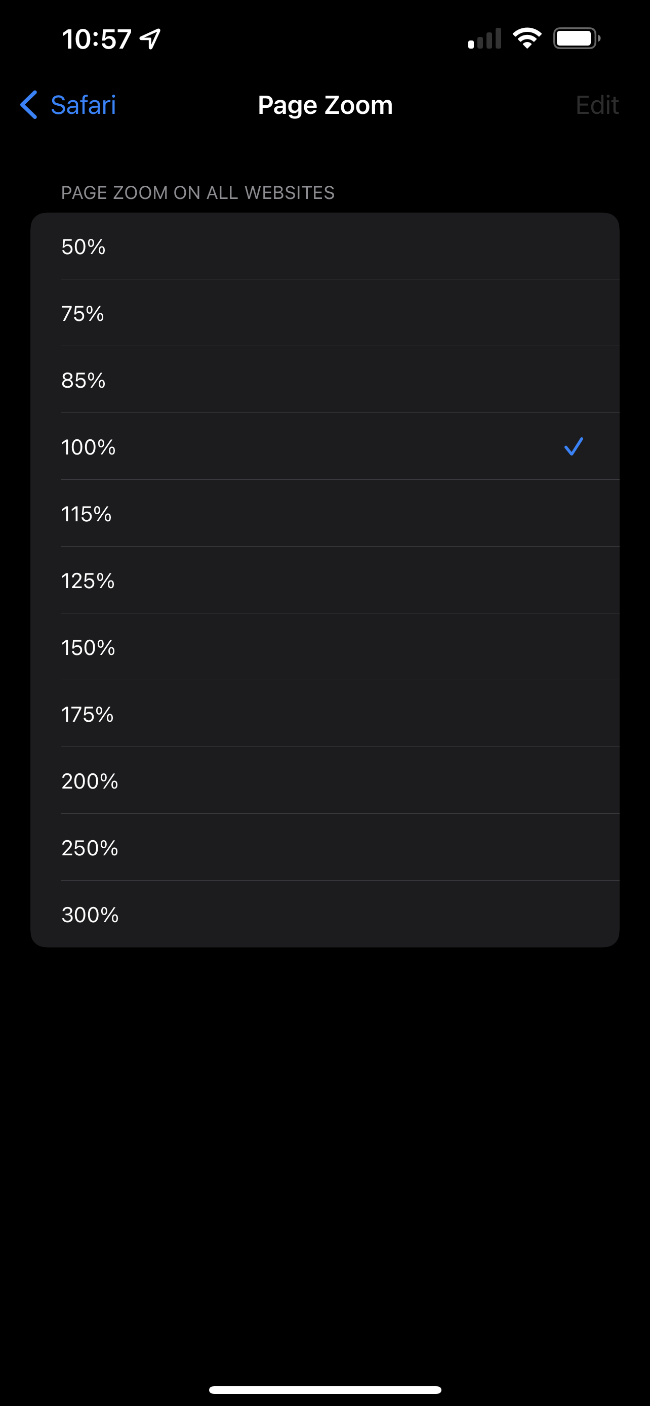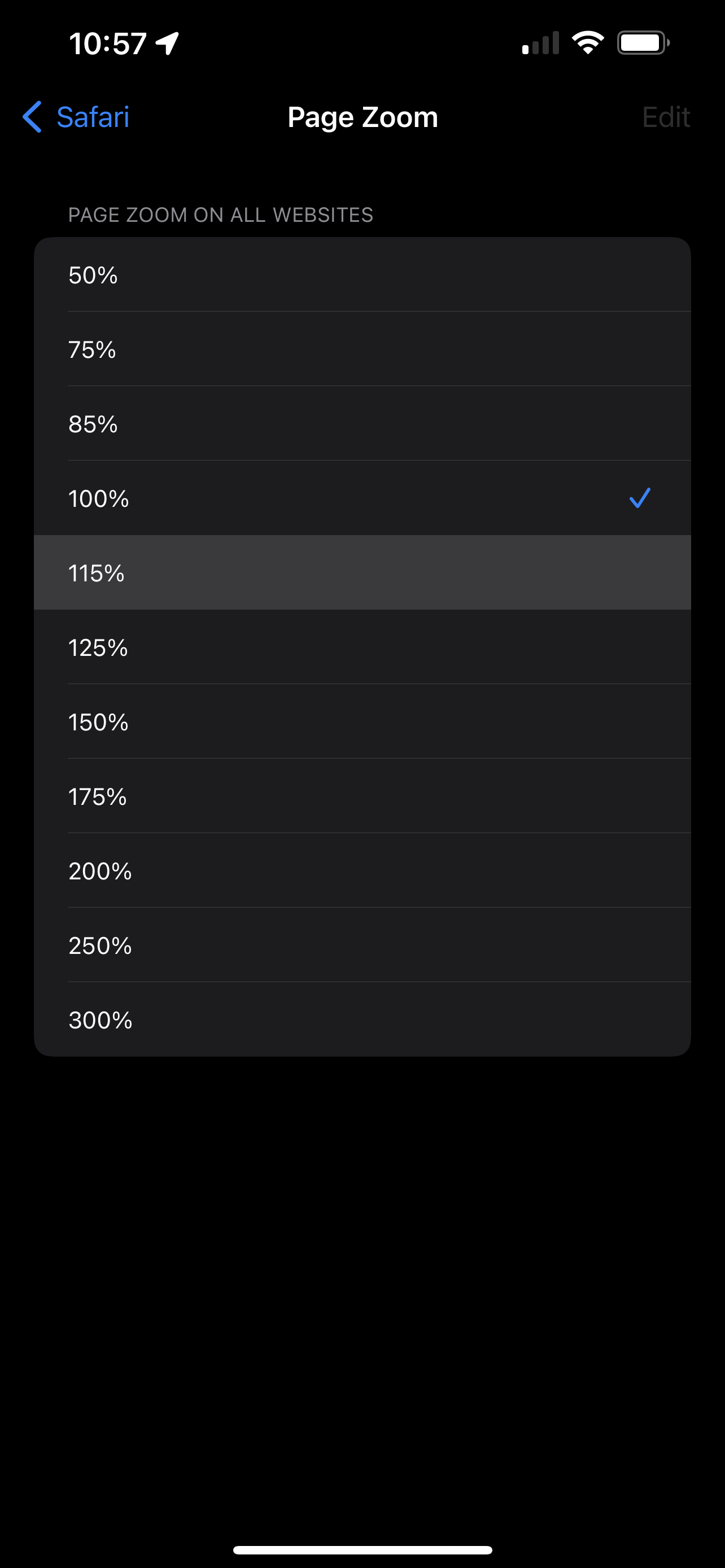 Running iOS 15.5 on my IPhone 13Pro max and having an issue with the page zoom in Safari. If I change the zoom on a webpage in safari it only will let me zoom out to 85% or zoom in to 115%. Seems to be this way on every website I try. So I went into Safari settings > Page Zoom and it won’t even let me change it from 100% in the settings. I tap all the other options and it doesn’t do anything. Anyone else having this issue? I’ve restored my phone, reset settings, cleared browser history etc. still not working