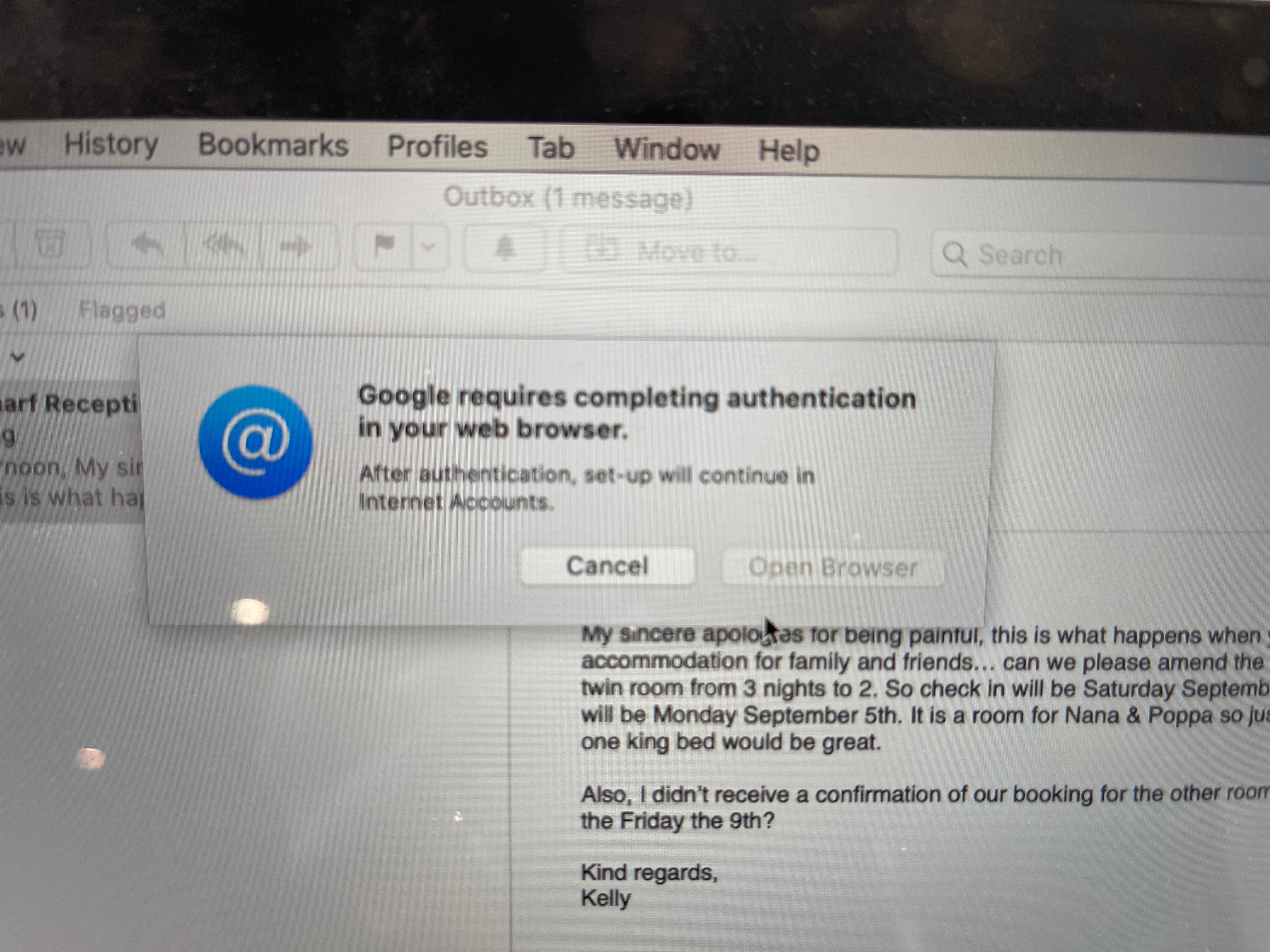 My MacBook suddenly starting coming up with a prompt saying Google requires authentication & none of my emails were being received or would send from it. So I deleted the account and tried to te add it and the same prompt comes up.