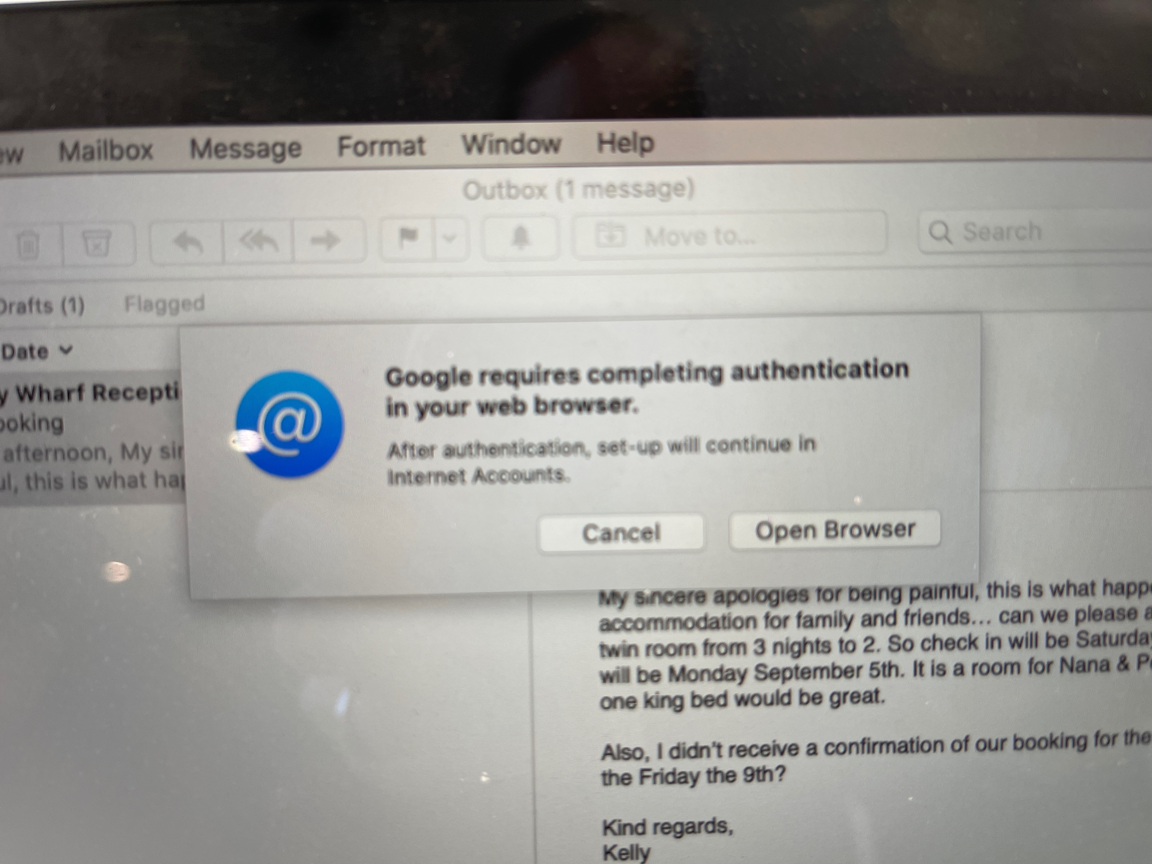 My MacBook suddenly starting coming up with a prompt saying Google requires authentication & none of my emails were being received or would send from it. So I deleted the account and tried to te add it and the same prompt comes up.