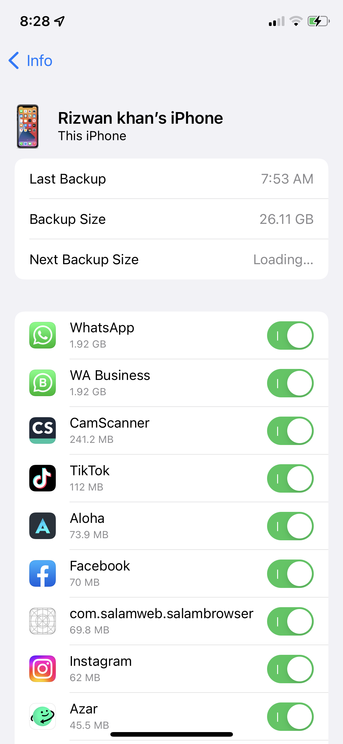 i dont know why my backup in icloud is showing around 25GB and it is captured half of my storage but when i click on backups to know details why this much space is consumed i can see only whatsapp is using 2GB and every other app is consuming less than 85MB and if i total every apps data it is totalled less than 10GB. Screenshots are attached please guide me what to do without losing anything.