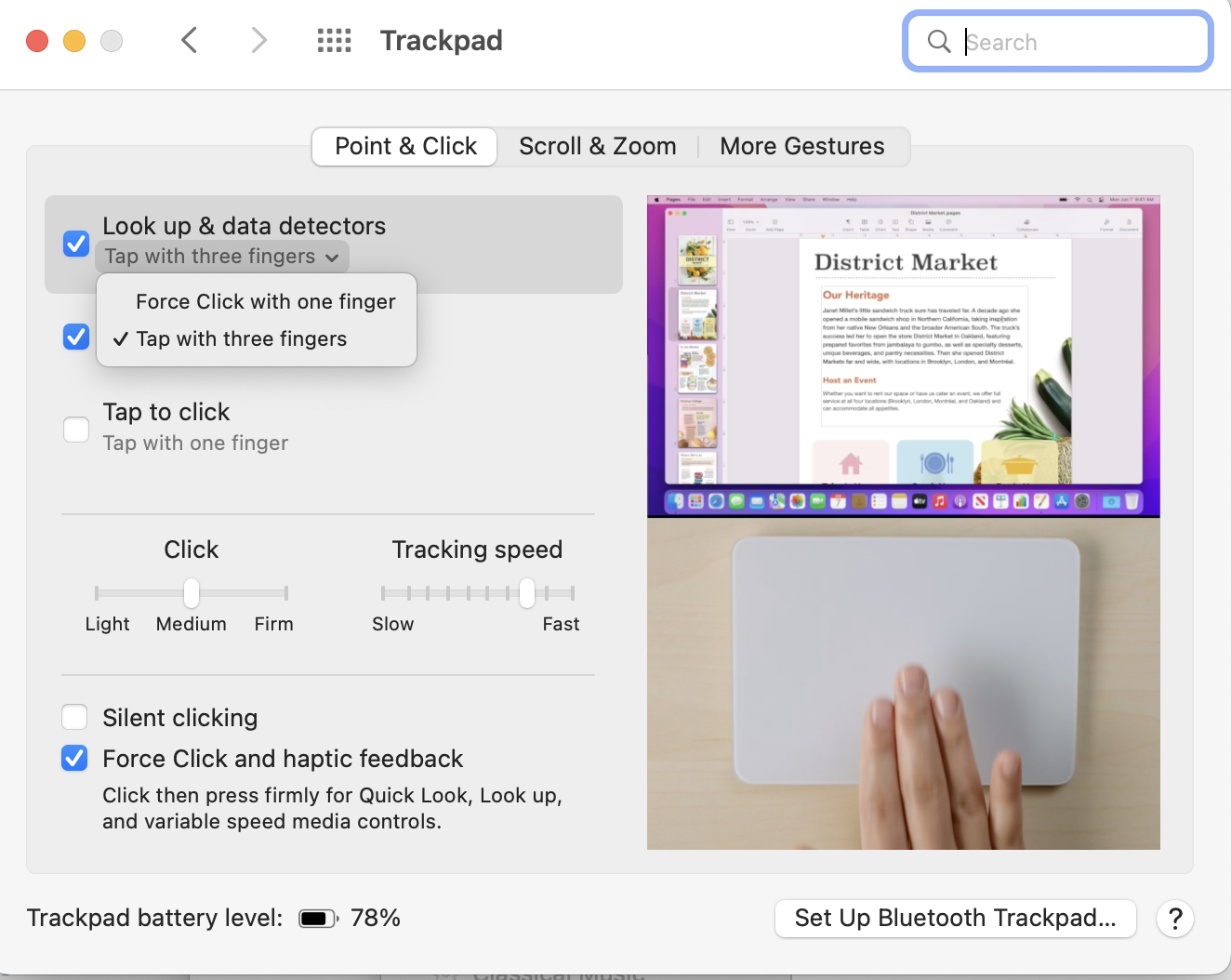 If the cursor is on a word, and I click down and hold, I get the start of a selection and I can drag to select. However, if I don't drag, but instead click down even harder without raising the first click, a window opens with the Dictionary/Thesaurus.