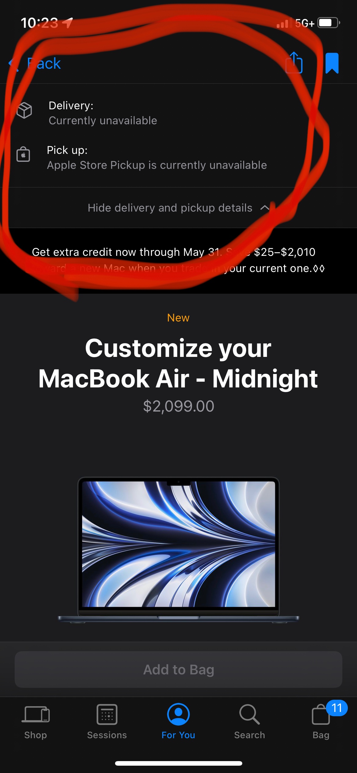 I cant buy a MacBook Air on the apple store app. I cant have it delivered or pick it up in store it says not available. Not even deliver?? For some reason it would let me buy and add to cart literally anything but the m2 MacBook Air (specifically) and any other MacBook Air. Is there a solution on my end or are there seriously no macbooks you guys have