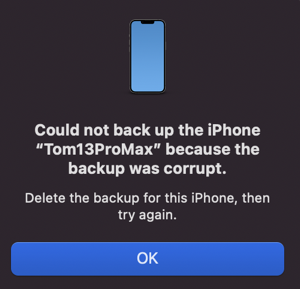 It stopped backing up. If I try to backup with Backup Now, I get a message that my backup is corrupted and to delete it. I deleted the backup, and the archives. The Mac now shows that it's never backed up the phone.