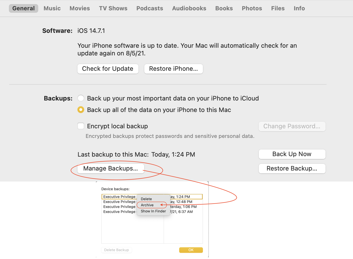 holding the Control key when selecting a backup there, reveals the options: I like to keep one archive that does not get over written.