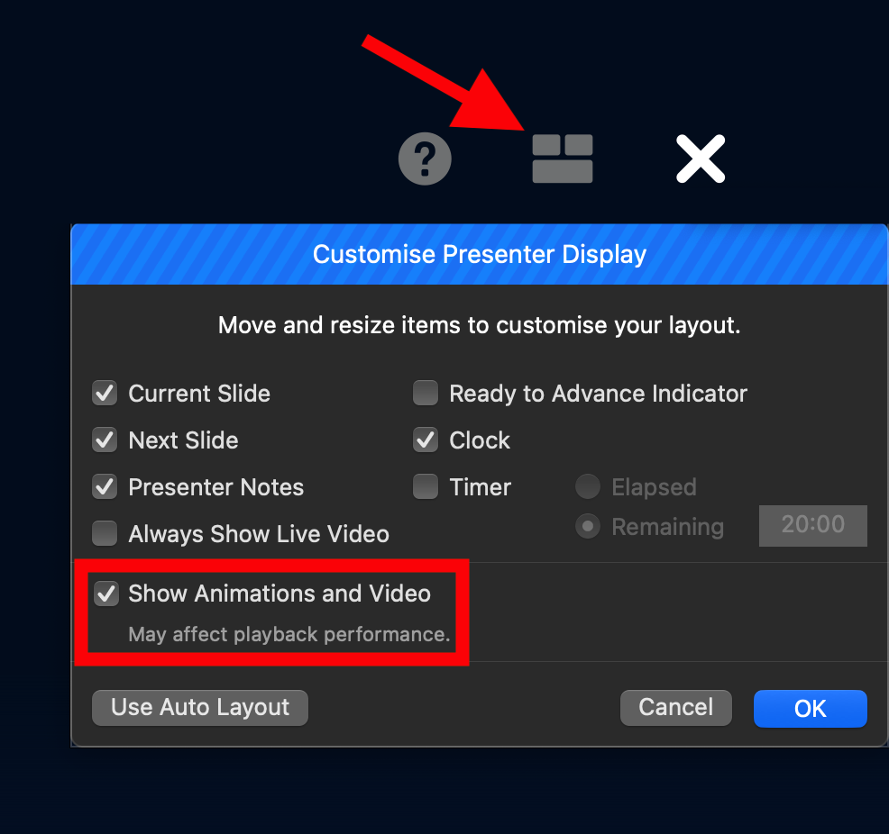 However, when I do this from my laptop onto a TV screen, I cannot see any of the animated moves. I can read my notes, and I can see still images of my photos, but I don’t get any of the animated moves. Can you help me resolve this problem?