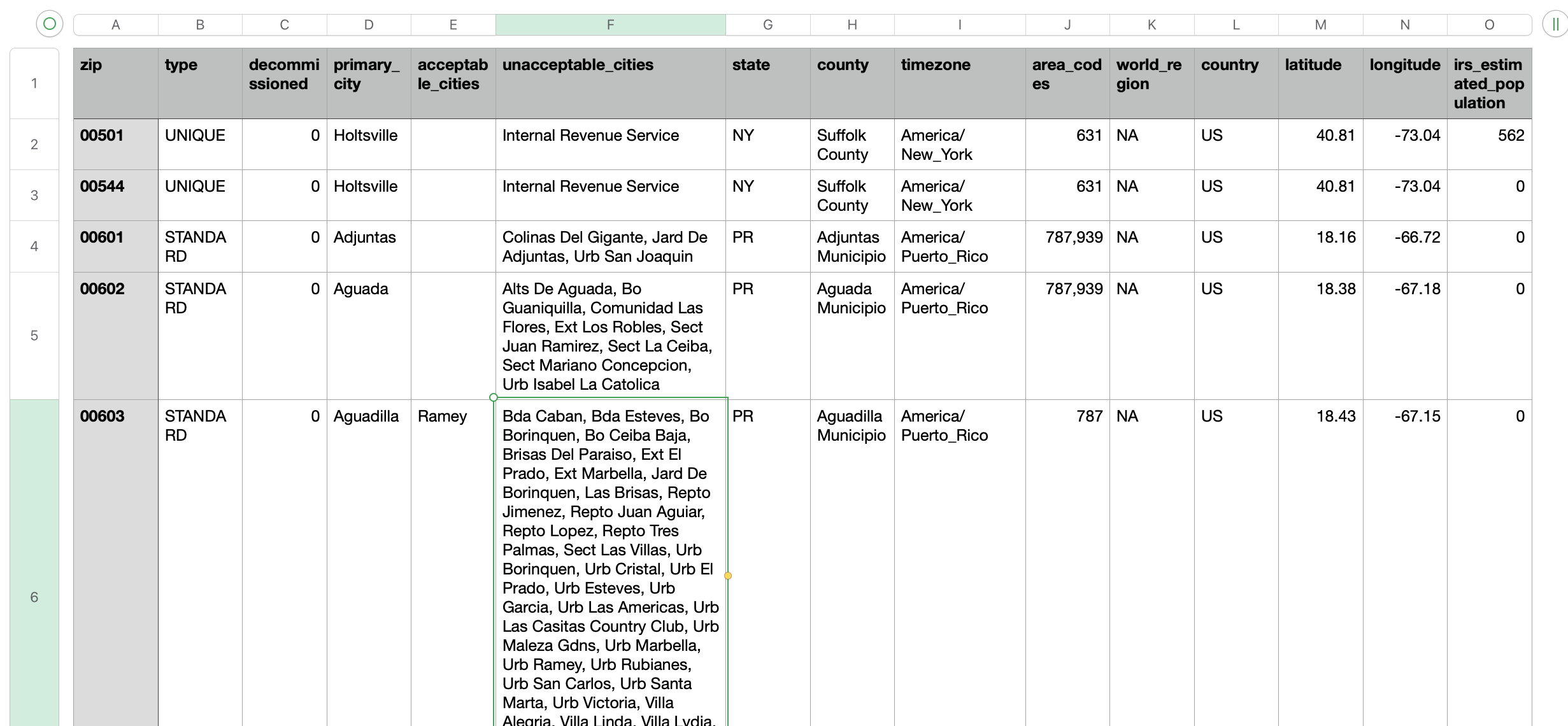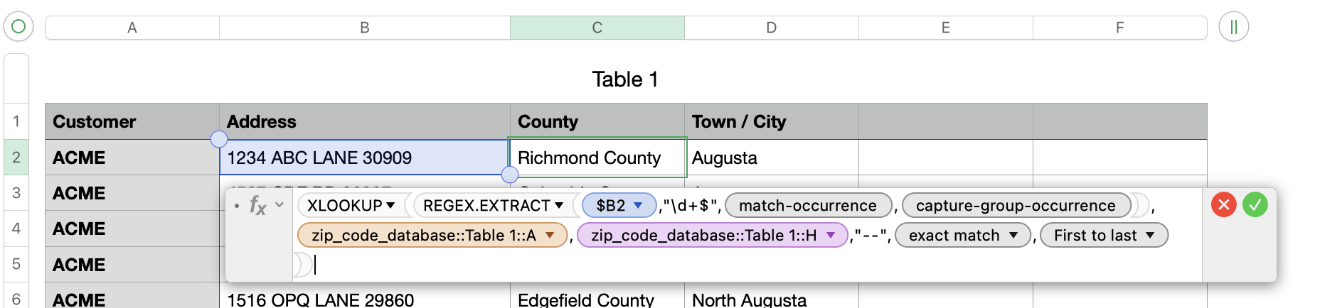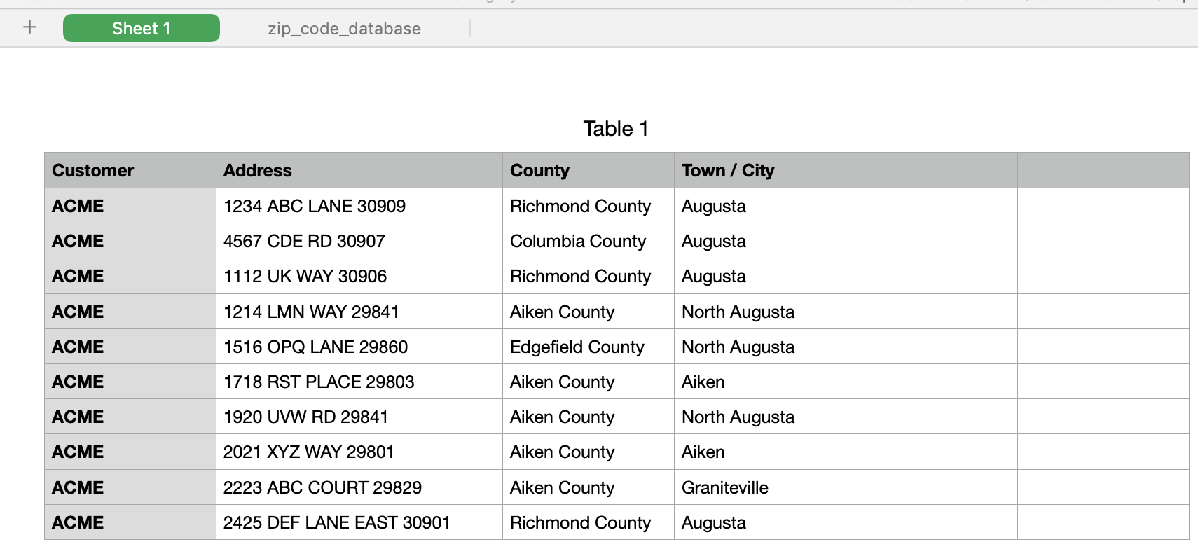 Example. 30909 populates into a cell next to a cell labeled Augusta.