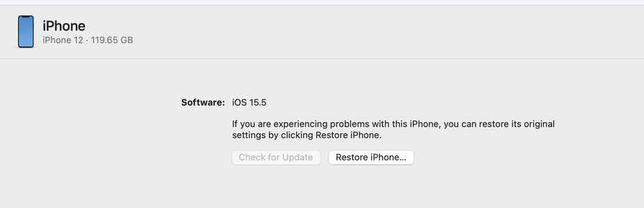 -When the iPhone gets connected to mac, it shows in the finder sidebar but the iPhone only shows "If you are experiencing problems with your iPhone, you can restore its original settings by clicking restore iPhone"