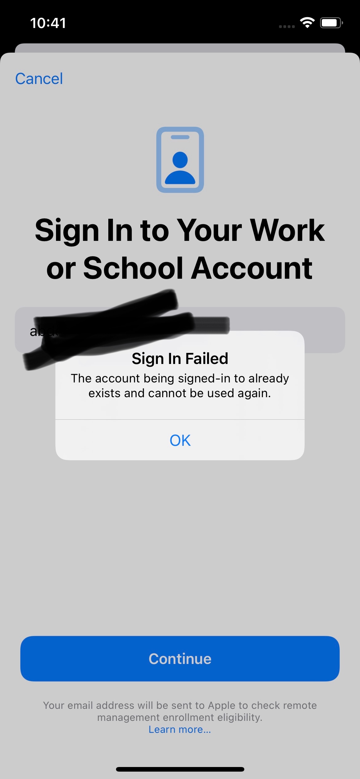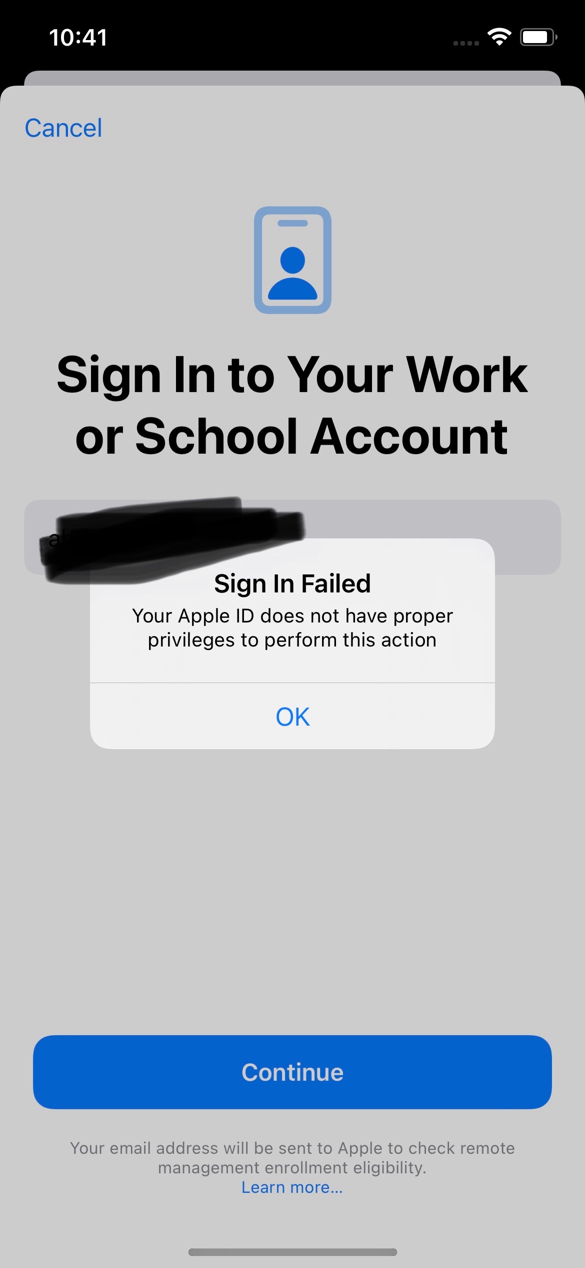 Was I enrolled in MDM? Sign In to Your Work or School Account shows different prompts for two working Apple IDs.