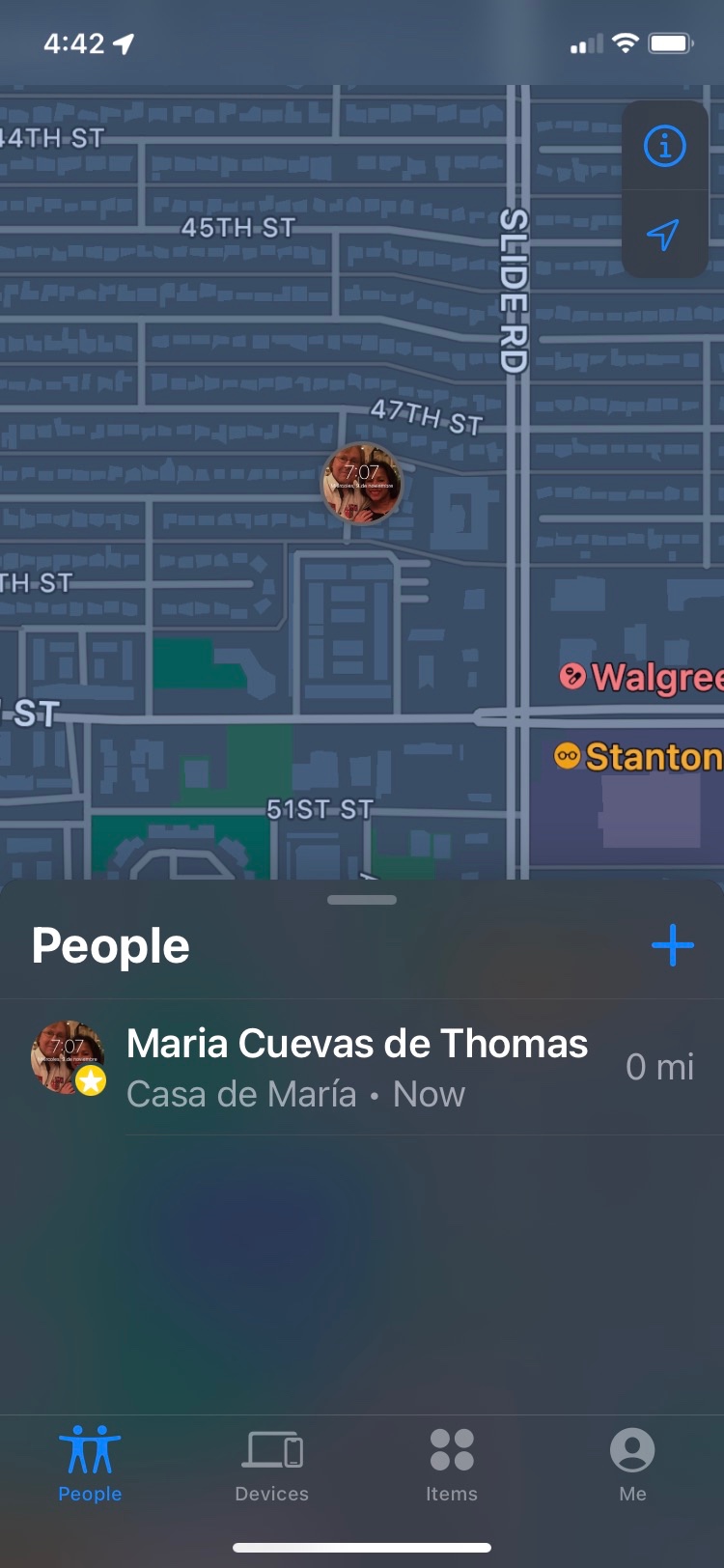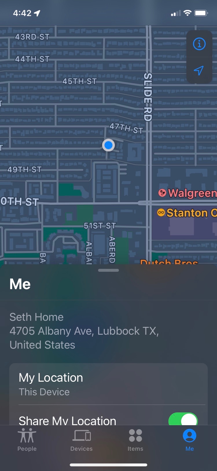 I will upload some screenshots from my wife’s iPad and my iPhone. My iPhone under People shows up on my wife’s iPad and her iPhone, but only my wife shows up on my iPad and iPhone. The options – Devices, Items(AirTags) and “Me“ all work as expected; but, not under People, only my wife shows up as part of family and with whom I share locations. If I select +, Under People, hoping to re-add my iPhone, you get the options to “share my location”, add AirTag or “add other item”, none of which allow me to re-add my iPhone under People. From the screenshots you can see my wife’s iPad shows both of us under People, but again, cannot find my iPhone 11, although it shows up fine under Devices. The next screenshot from my iPhone 11 under People only my wife shows up, and selecting the + there are three options, which do not allow me to re-add my iPhone.