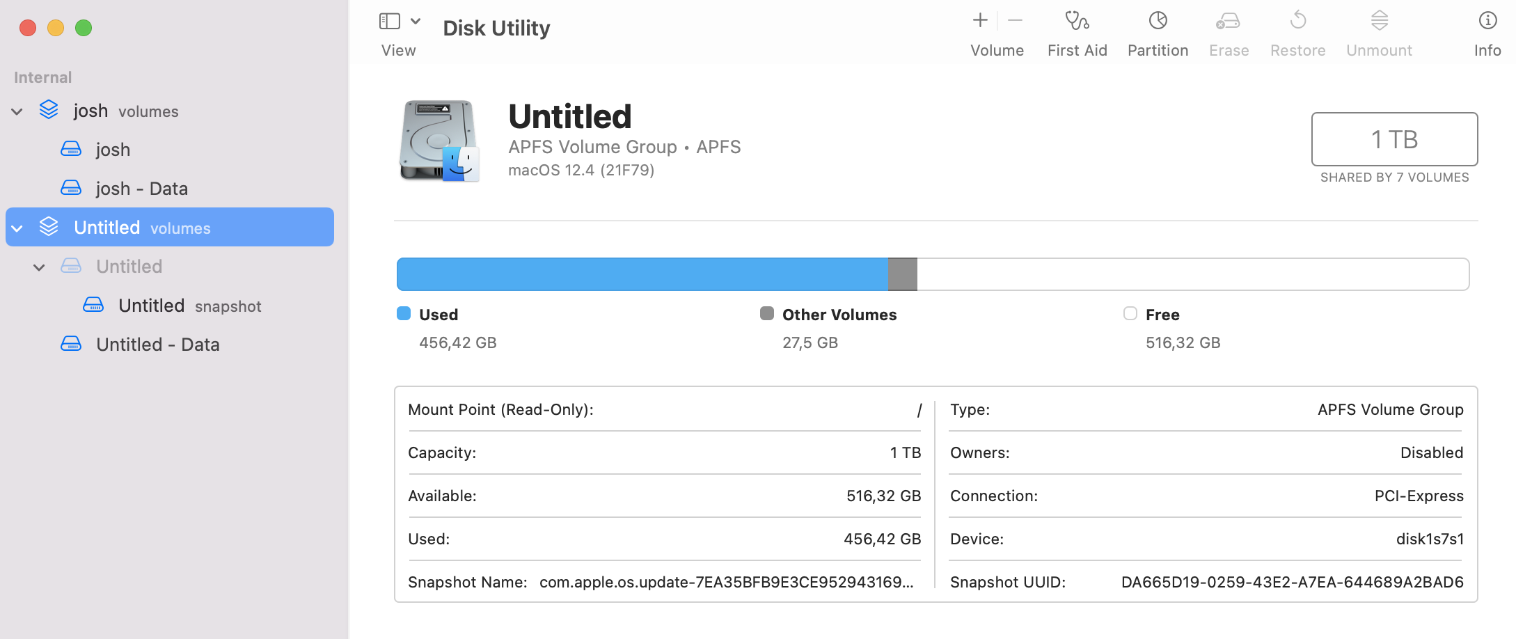 I have only one SSD drive on the macbook, but disk utility shows 2 volume groups, 2 system volumes and 2 data volumes.