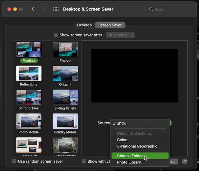 Open System Preferences > Desktop & Screen Saver > Screen Saver. Choose one of the rotating screen savers then choose the "Source" folder from the drop down menu.