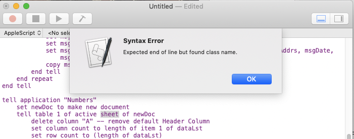 In the Script Editor app window, click the run button and watch the Running... indicator. If there are more than a hundred emails, the script can take many minutes to finish. If the script fails with a "Numbers got an error: Invalid row count.", then the script is not seeing any emails selected in the Mail app.