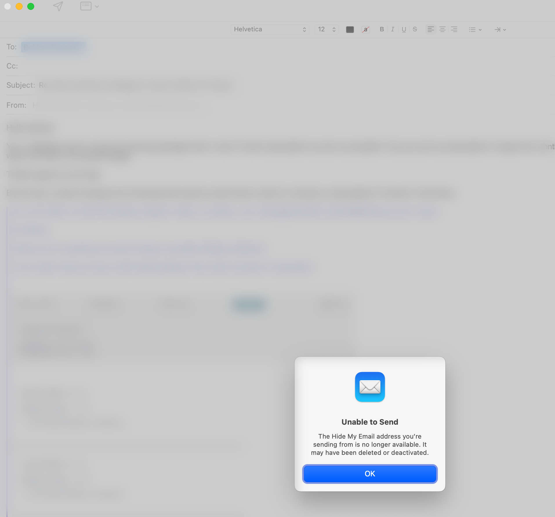 Hide My Email address falsely claims to be deactivated or deleted when replying in Apple Mail