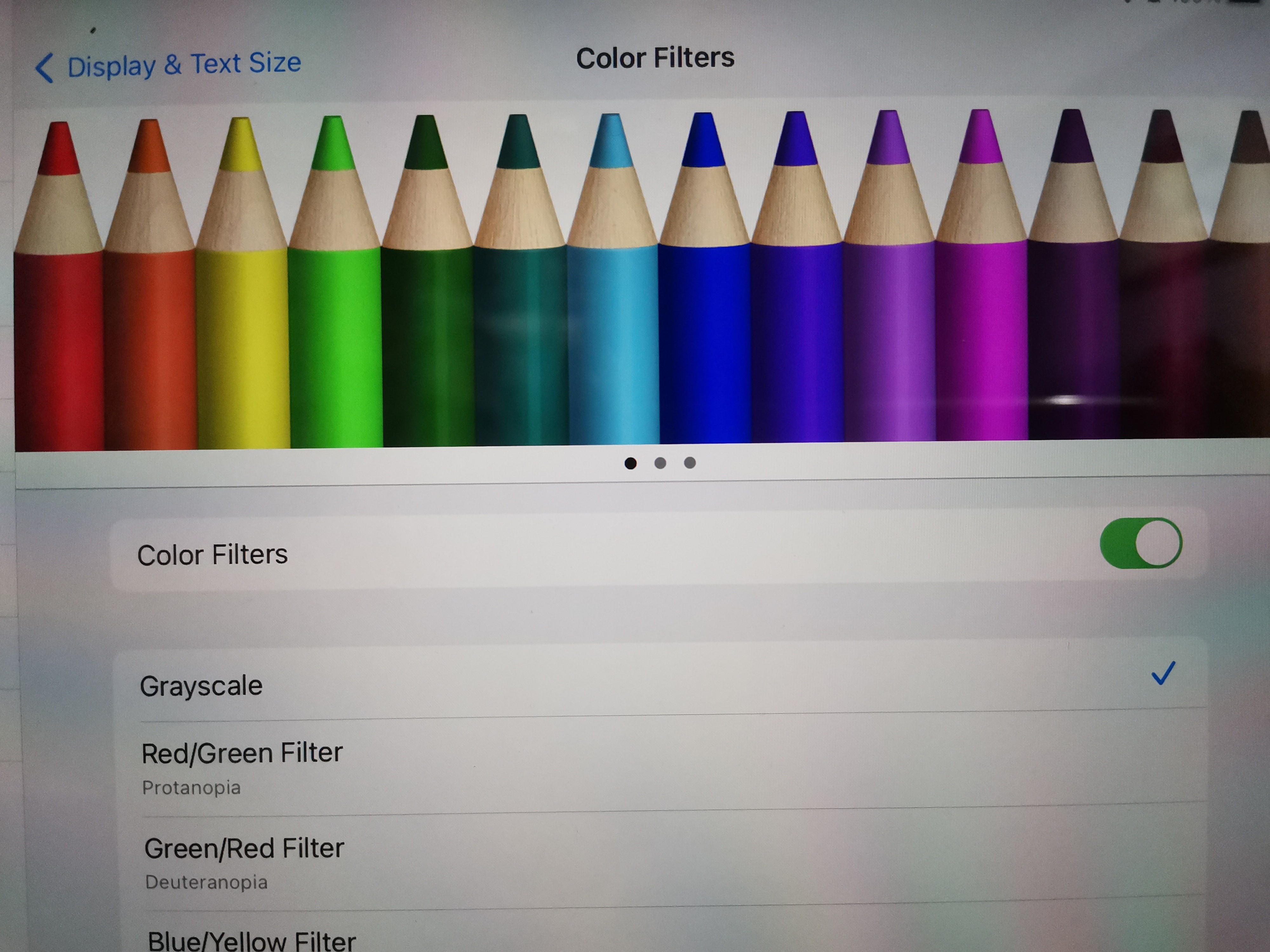 Wanted to turn on color filters to have it in grayscale mode but toggling color filters won't work. No grayscale filter, just the same colored mode. The other filters don't work either (red/green, green/red, etc.) How should I go about this?