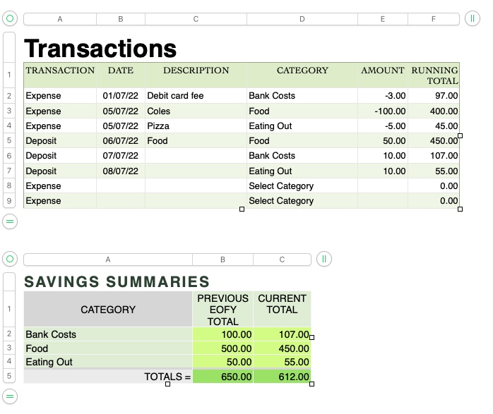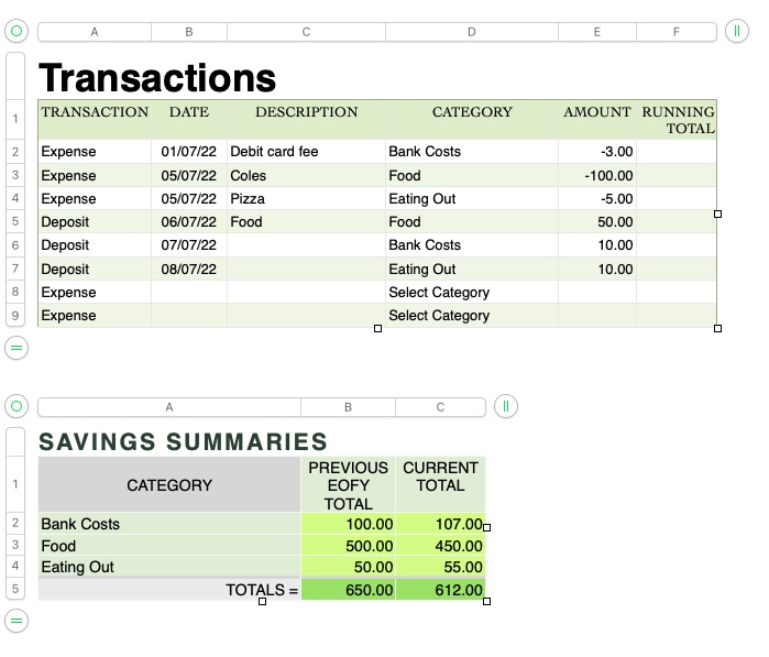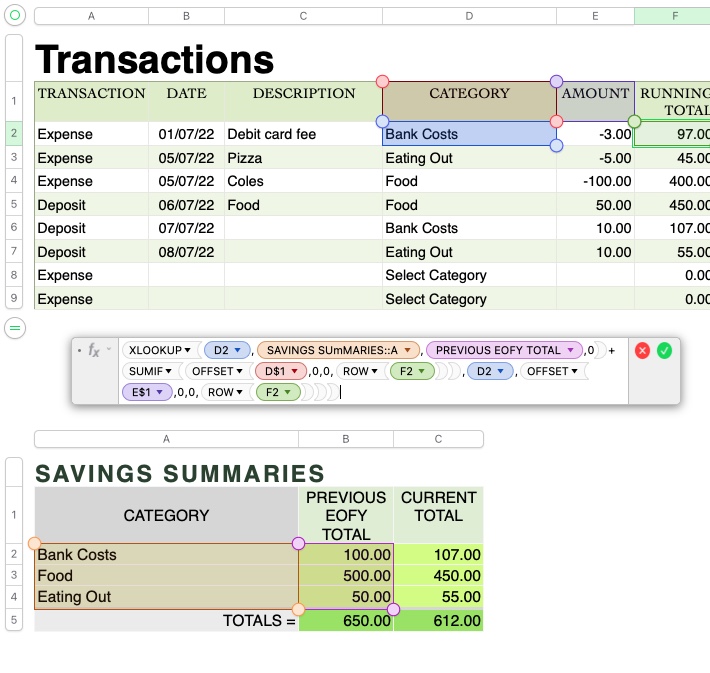 The formula does not need to refer to the end of financial year date as the TRANSACTIONS Table is for the current year only. The formula would just need to refer to the opening balance (PREVIOUS EOFY TOTAL) for each Category which is stored in Column B of the SAVINGS SUMMARIES Table.