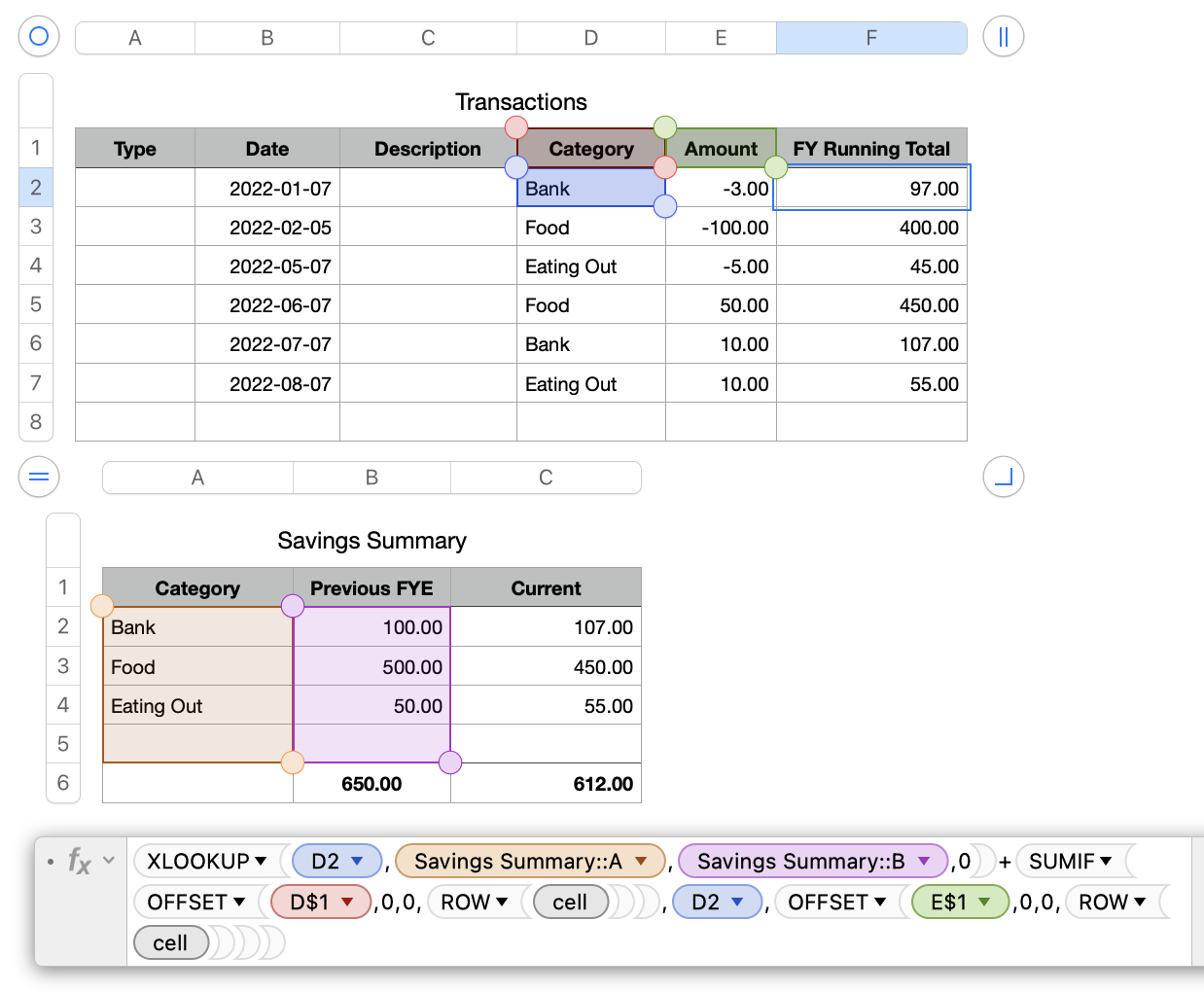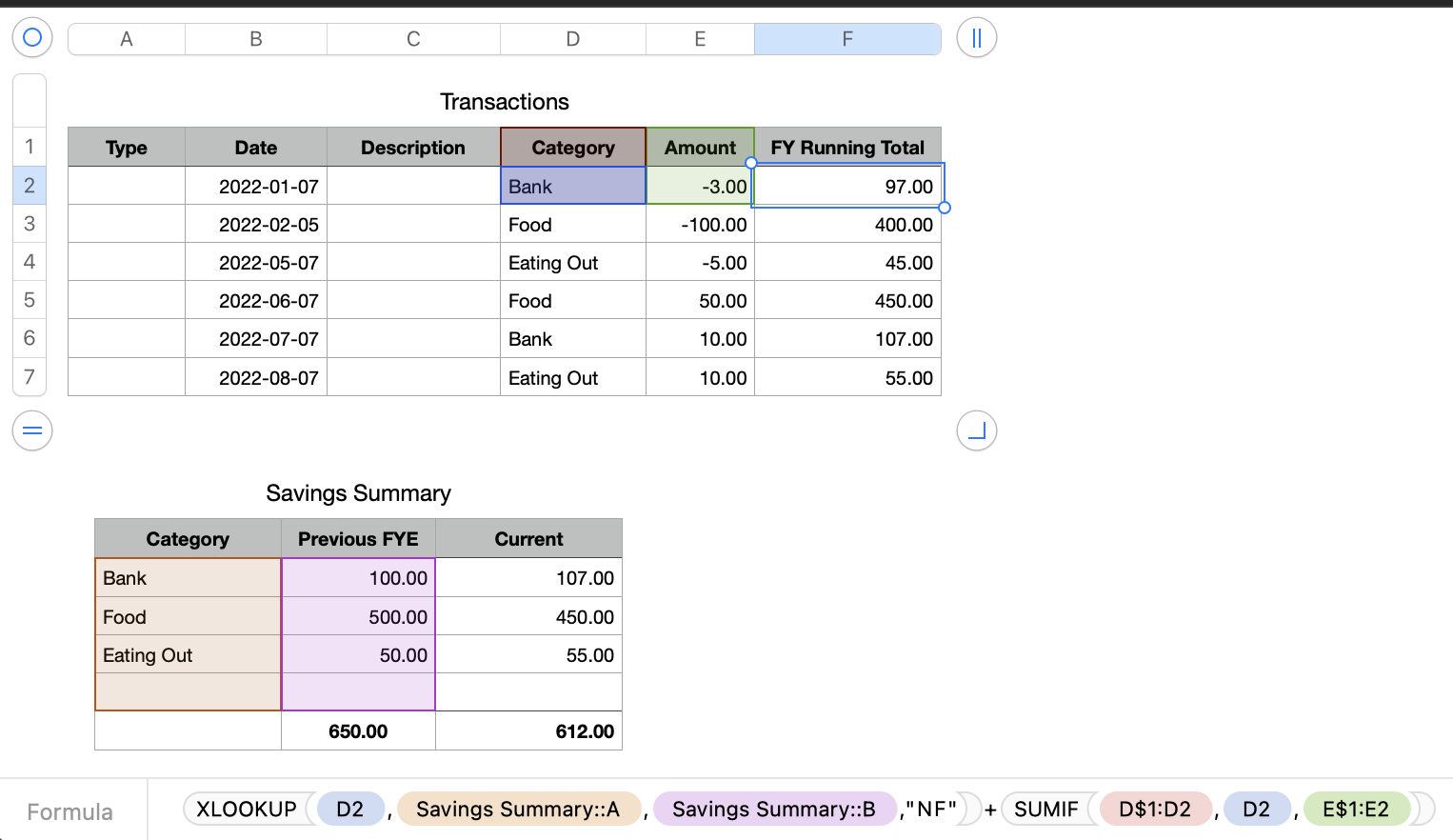 =XLOOKUP(D2,Savings Summary::A,Savings Summary::B,"NF")+SUMIF(D$1:D2,D2,E$1:E2)