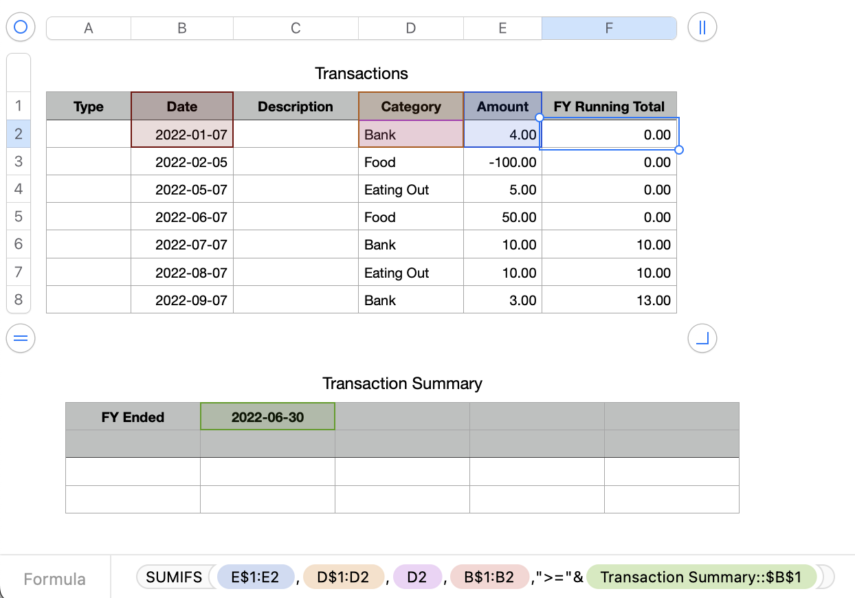 I'd like to create a Running Total column in my TRANSACTION Table based upon CATEGORIES and upon the previous End of Financial Year total located in the TRANSACTION SUMMARY table.