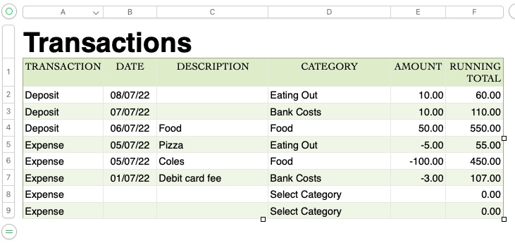 From my attached table screen shots - In the TRANSACTIONS Table I'd like to having running totals in Column F based upon whatever category is selected in Column D. This is so I can see the balance for each Category at any particular transaction date.