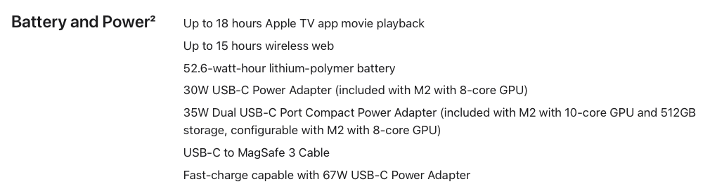 30 or 35 depending on which configuration you have (or 67 if you buy a different power adapter): MacBook Air with M2 chip - Tech Specs - Apple
